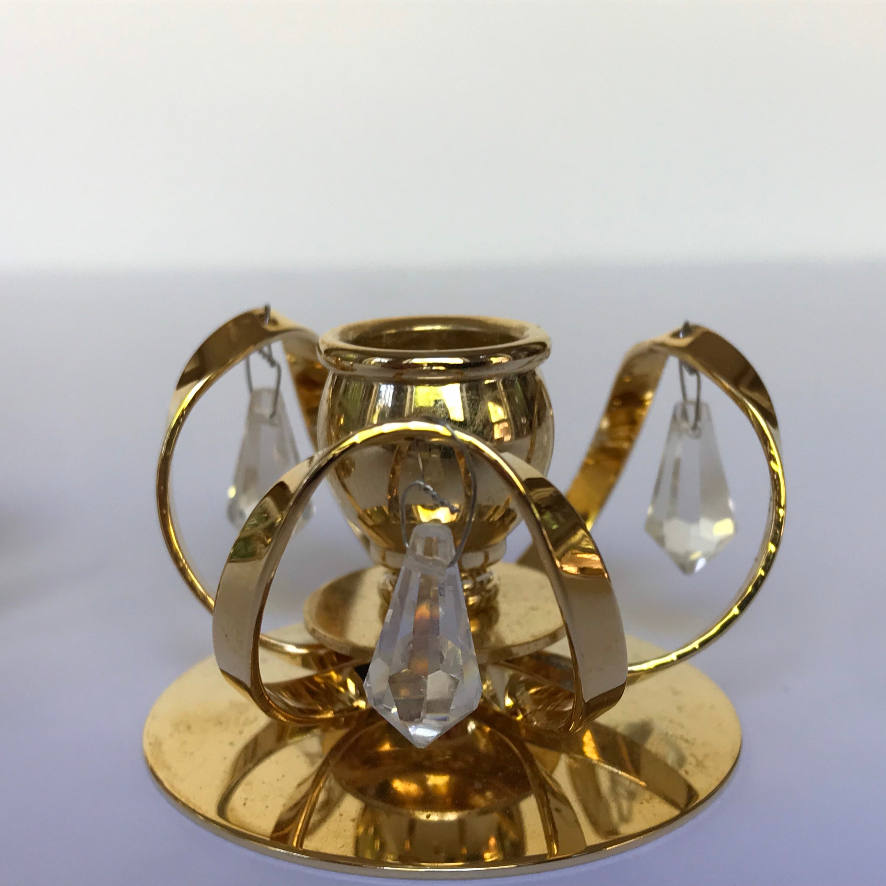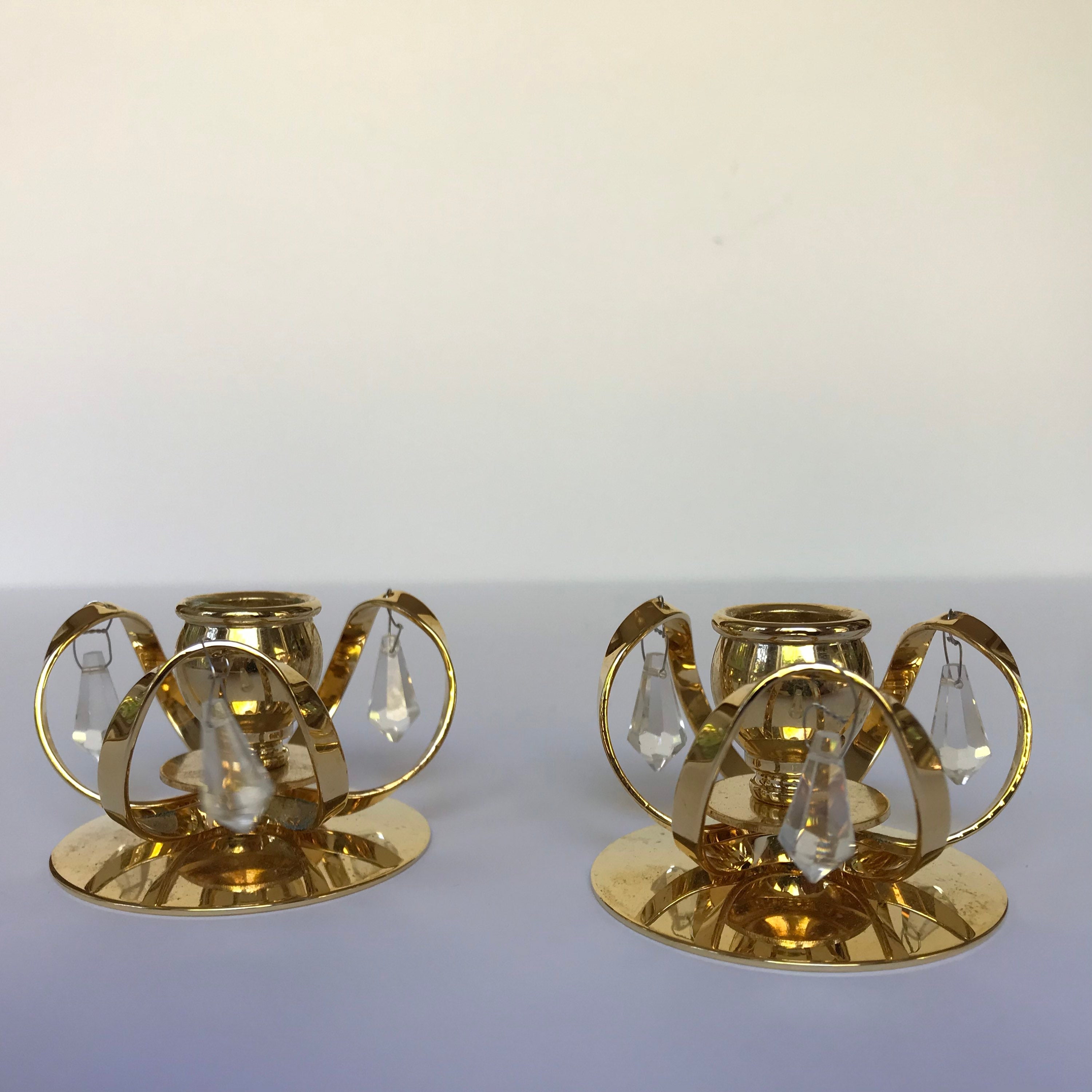 This listing is for a pair of Lycenta Sweden candleholders. They are gorgeous gold plated and crystal candleholders made in the 1980s. I am not sure what material the crystals are made out of. These candleholders take small 1/2 inch size candles.