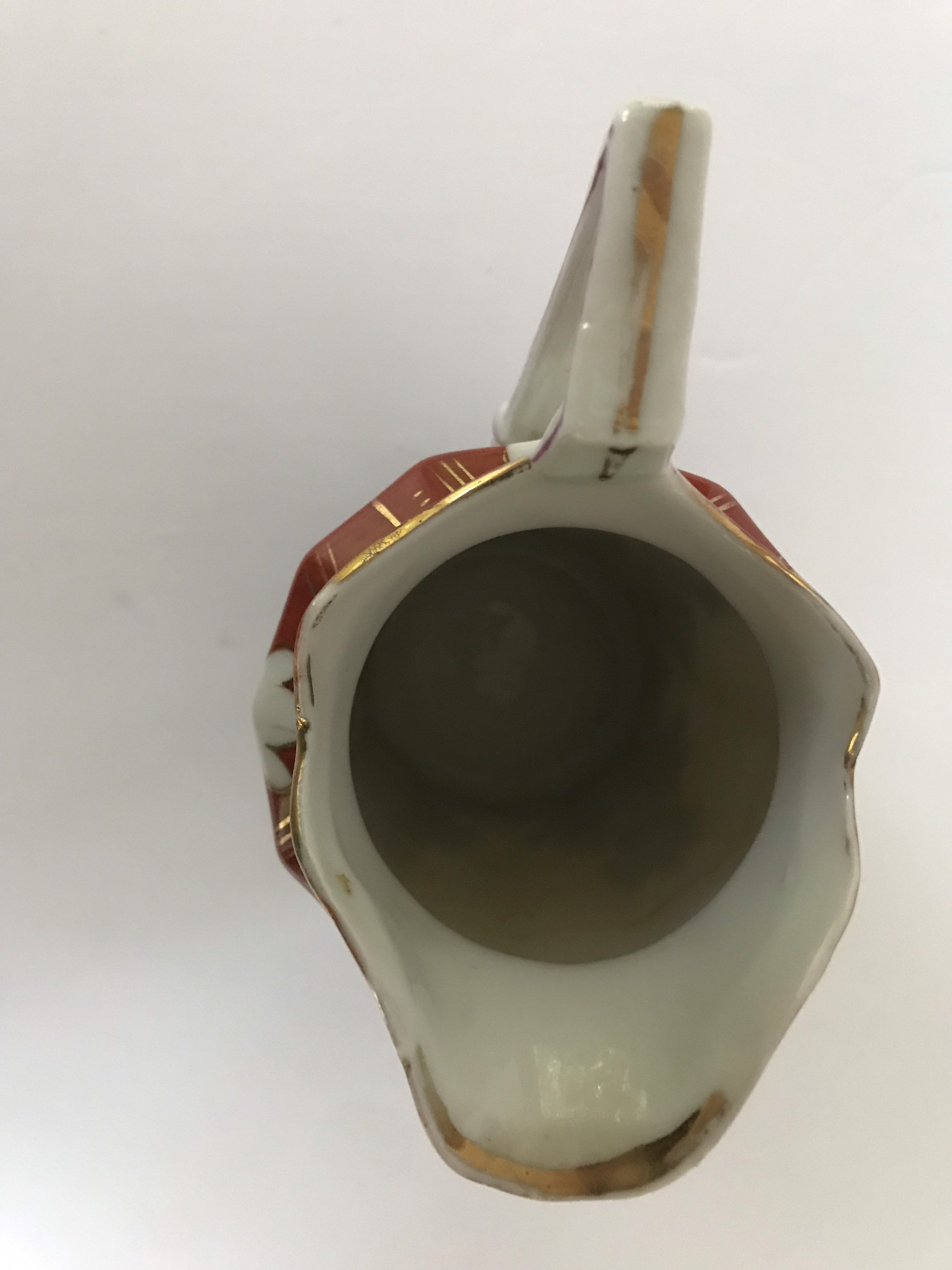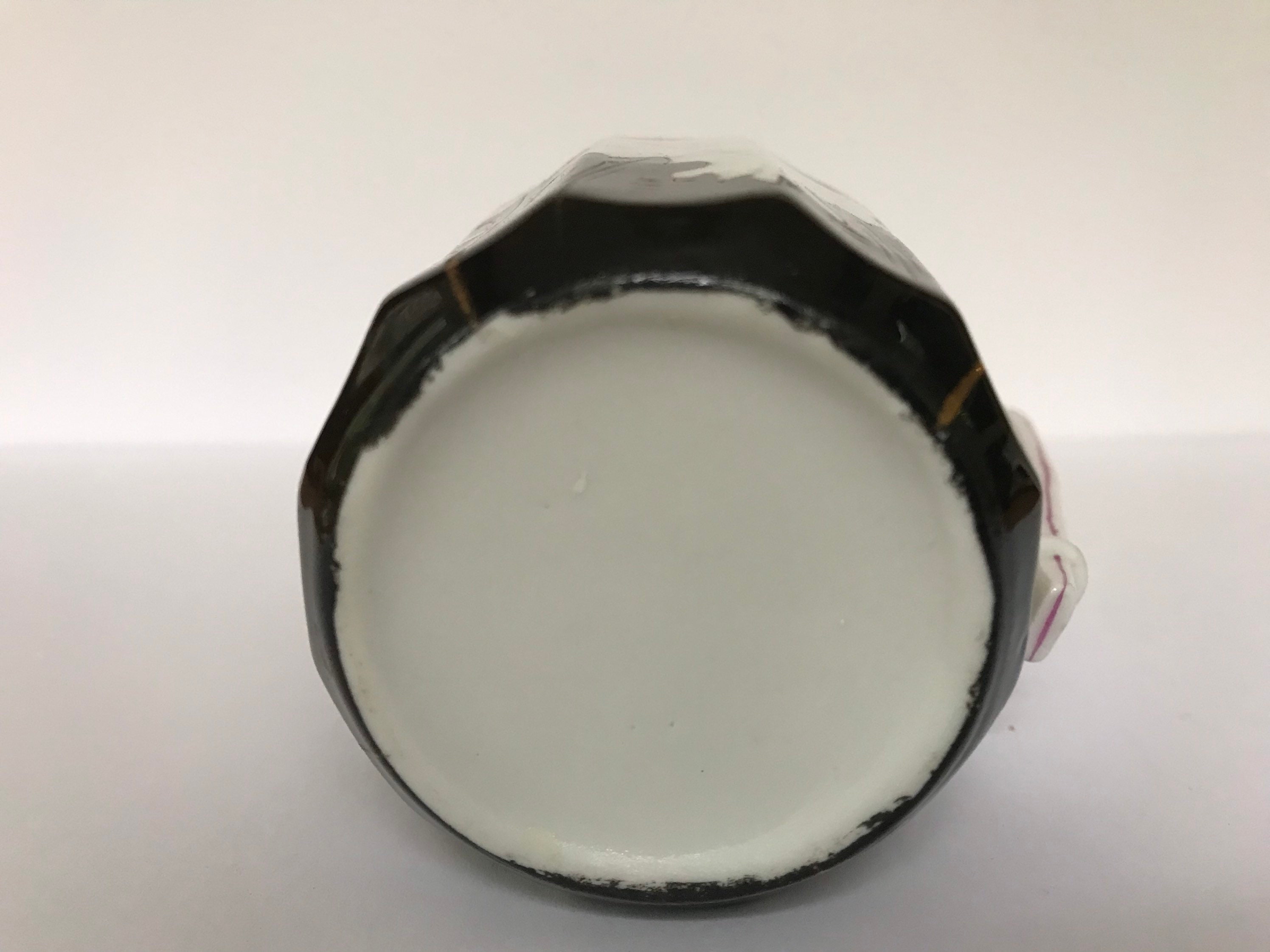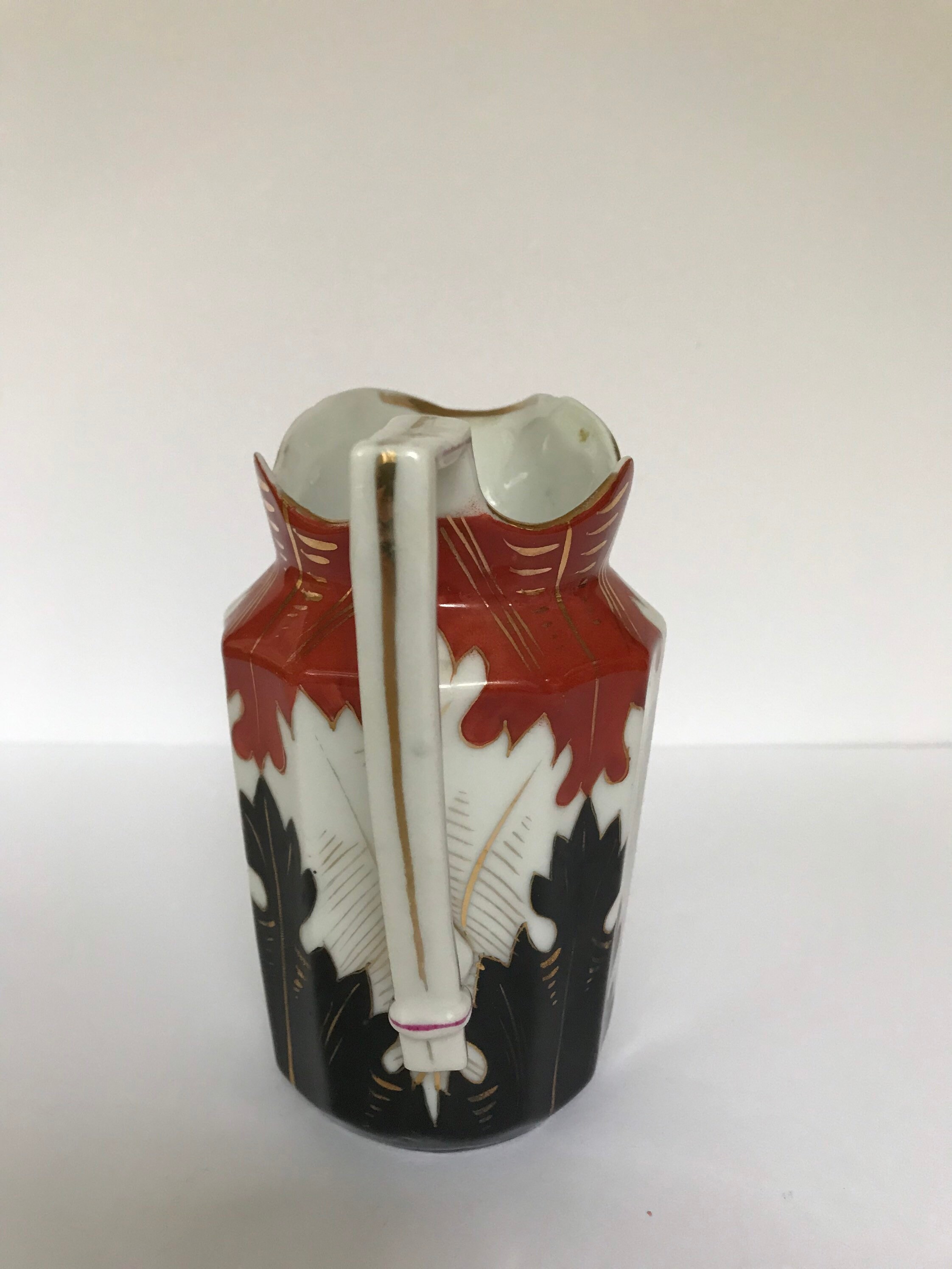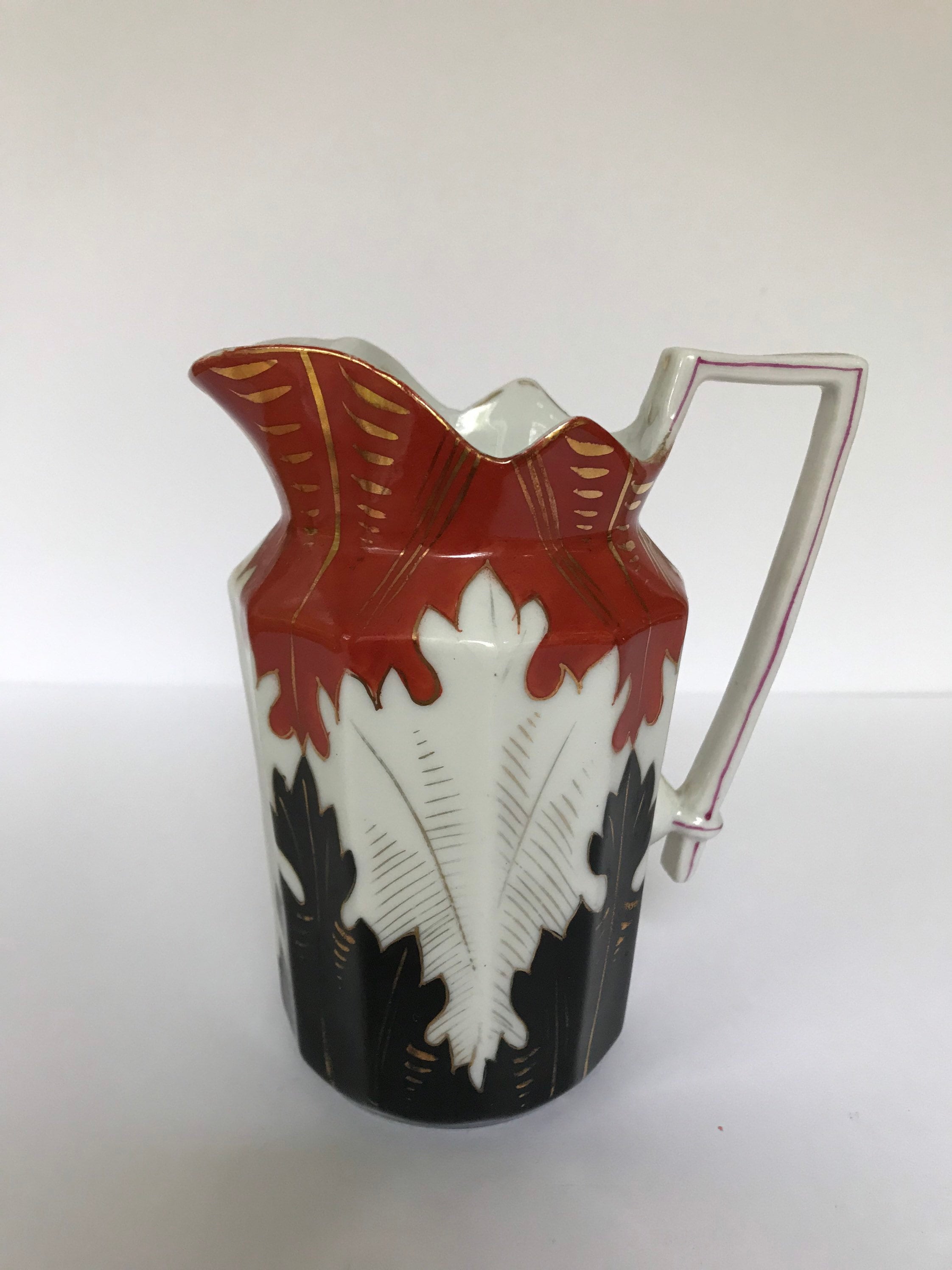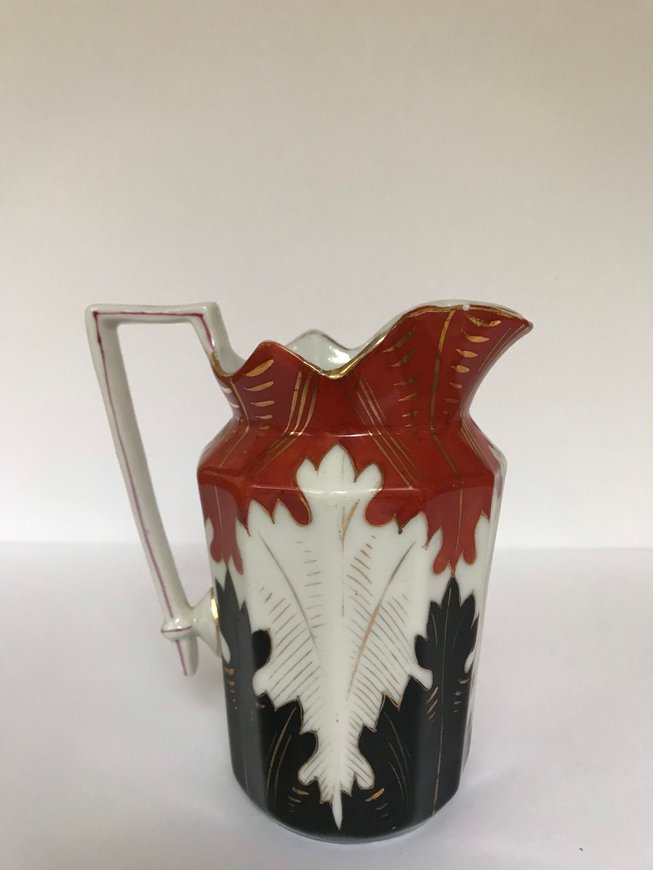 Beautiful hand painted black and orange and white antique creamer or pitcher. There is no maker mark but there appear to be spur marks from the kiln on the bottom. Maybe 19th century? I don't know the origins of this pitcher.