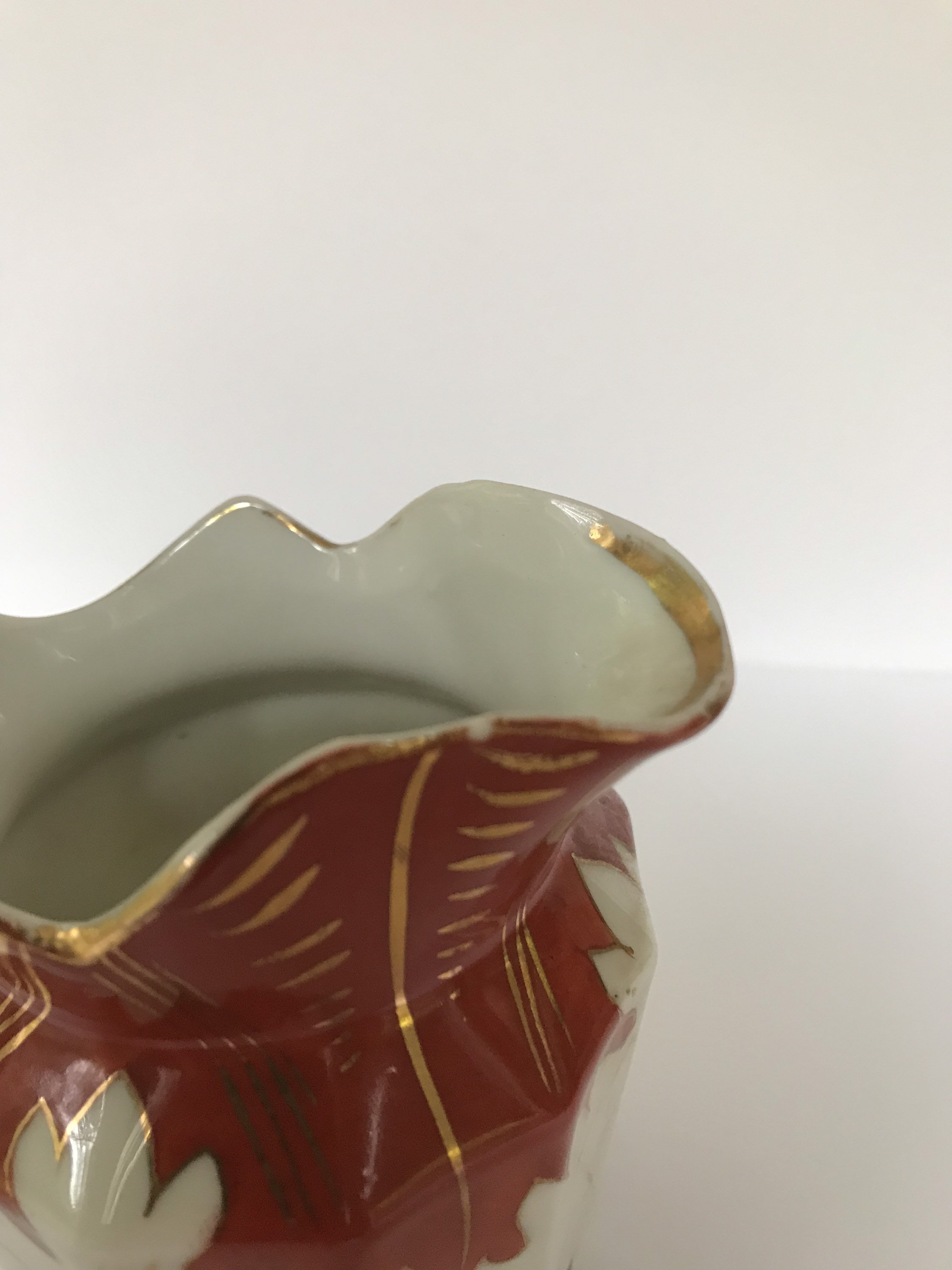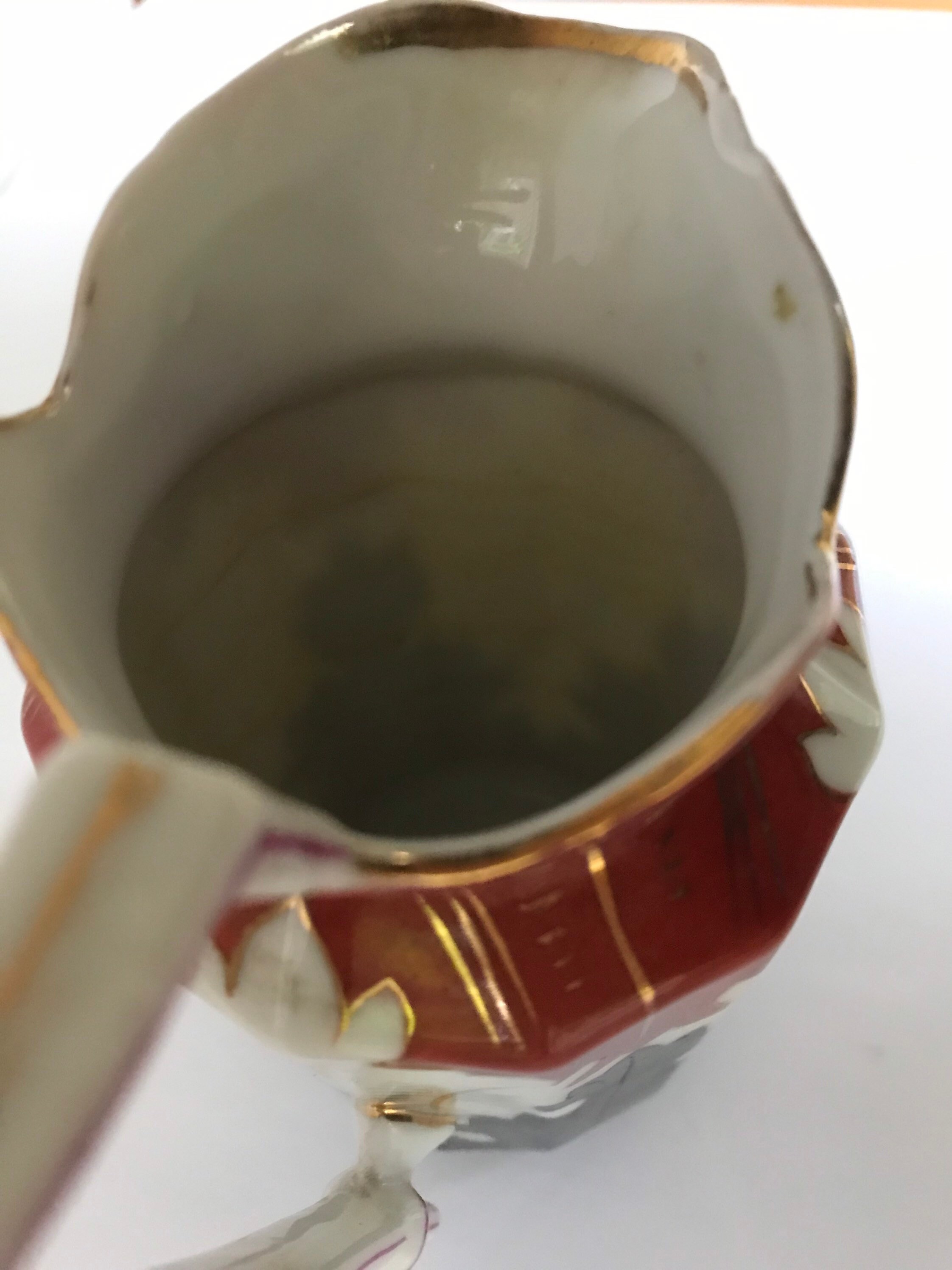 Condition: There is a small chip near the spout of the pitcher and staining on the inside. The gilding has some wear. It otherwise displays well.