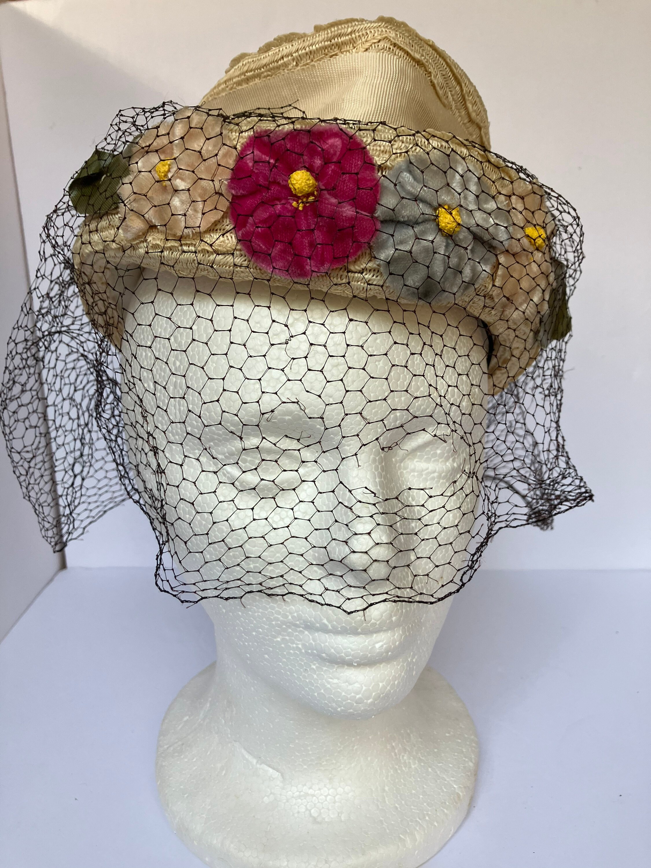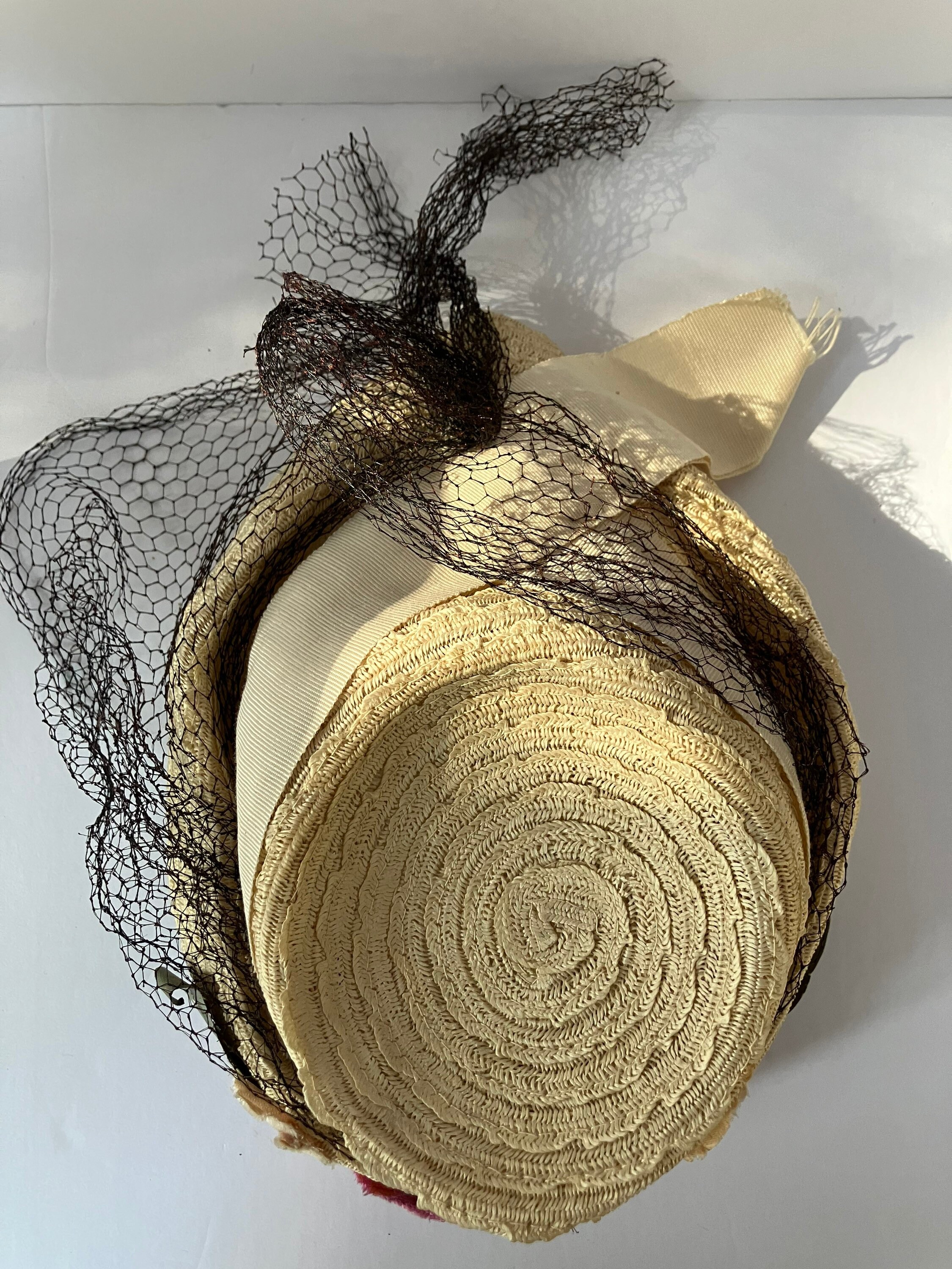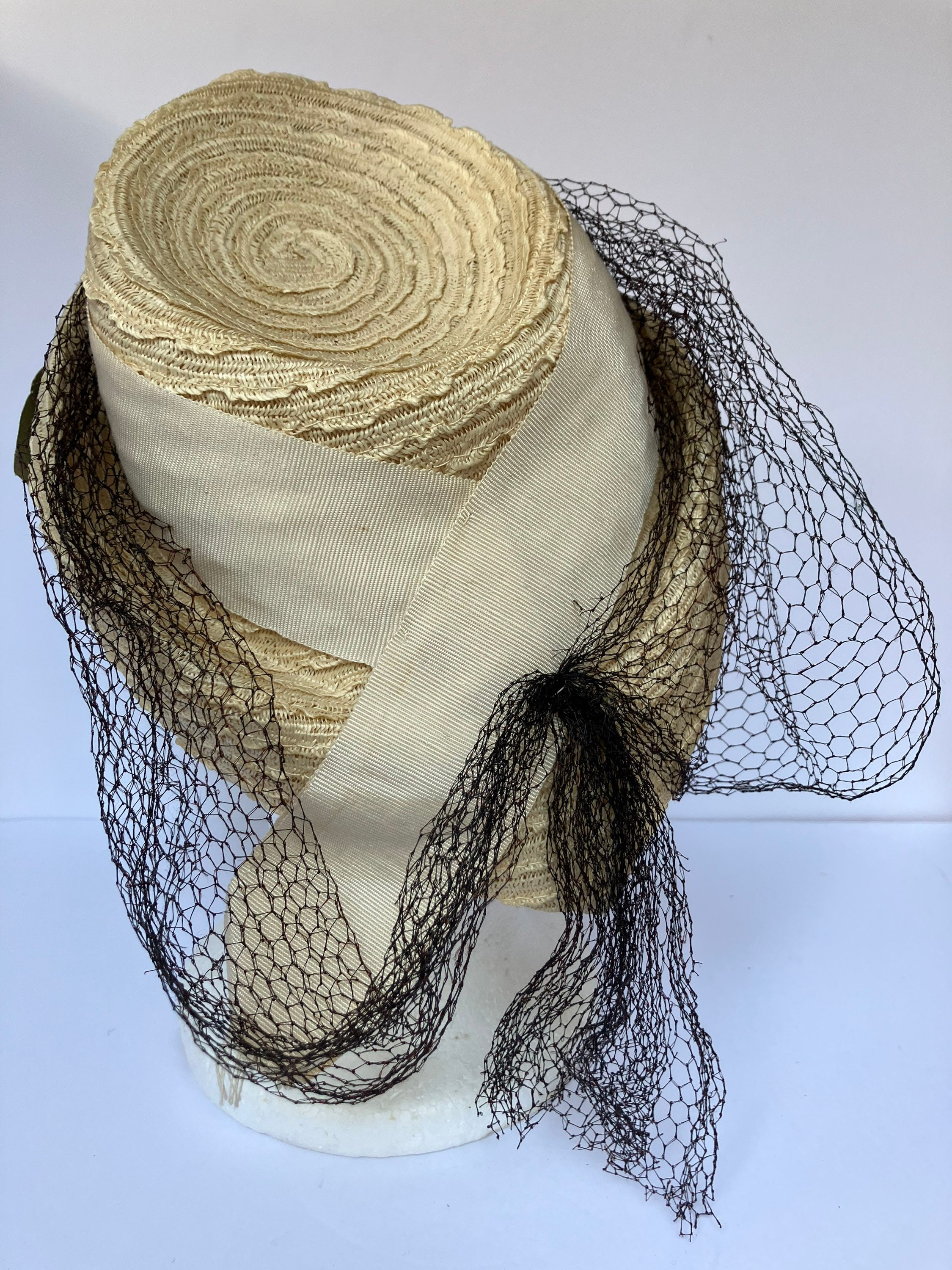 Condition: Good vintage condition. There are holes in the netting but the hat is in otherwise very good condition. There is some light fraying to the ribbon trim at the end. (Please see photos).