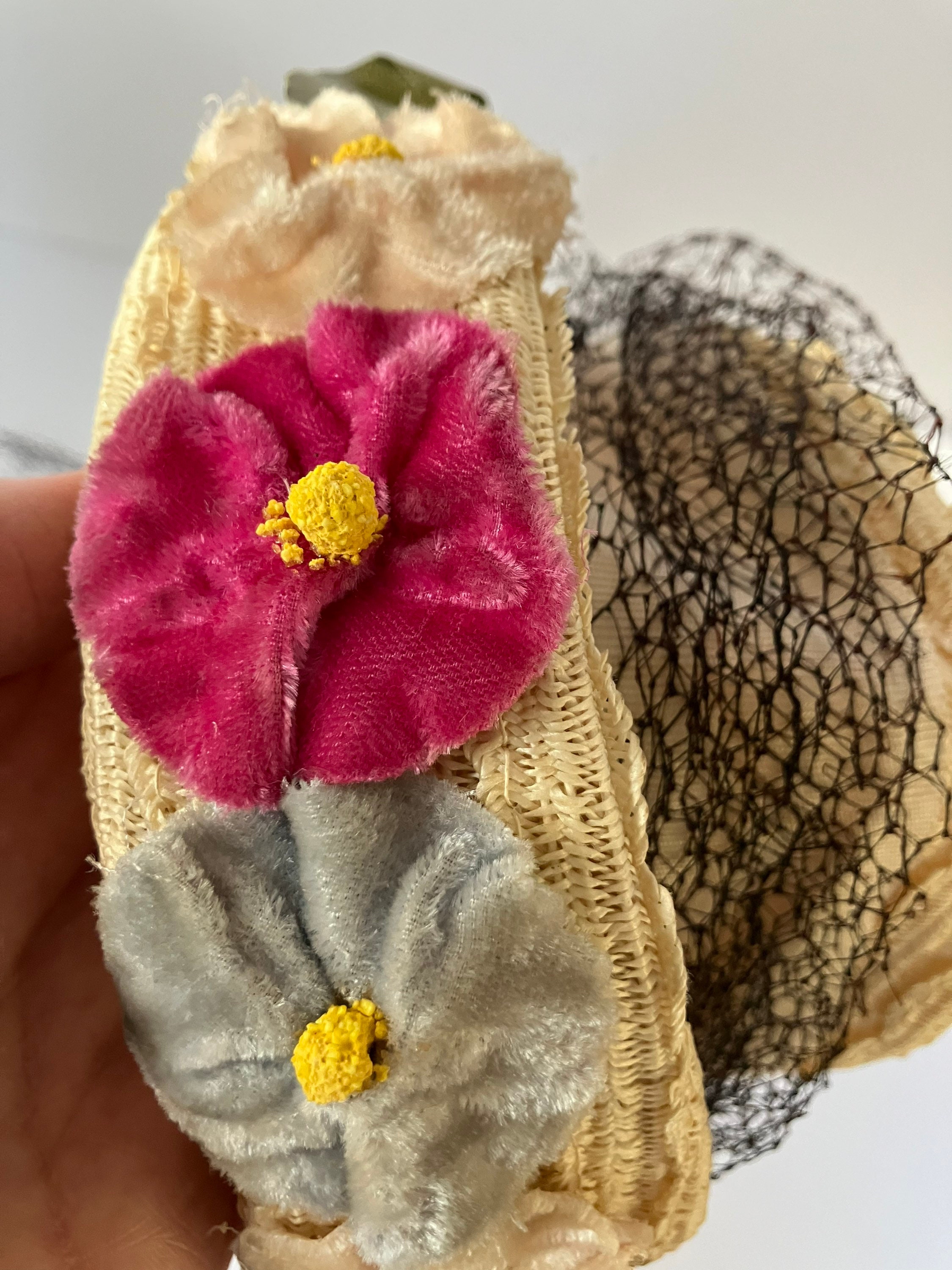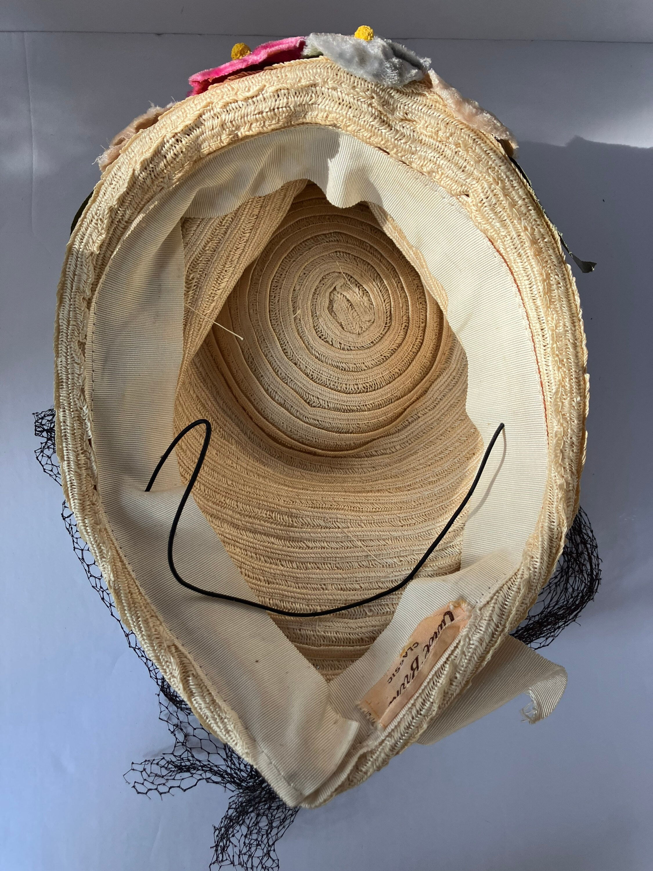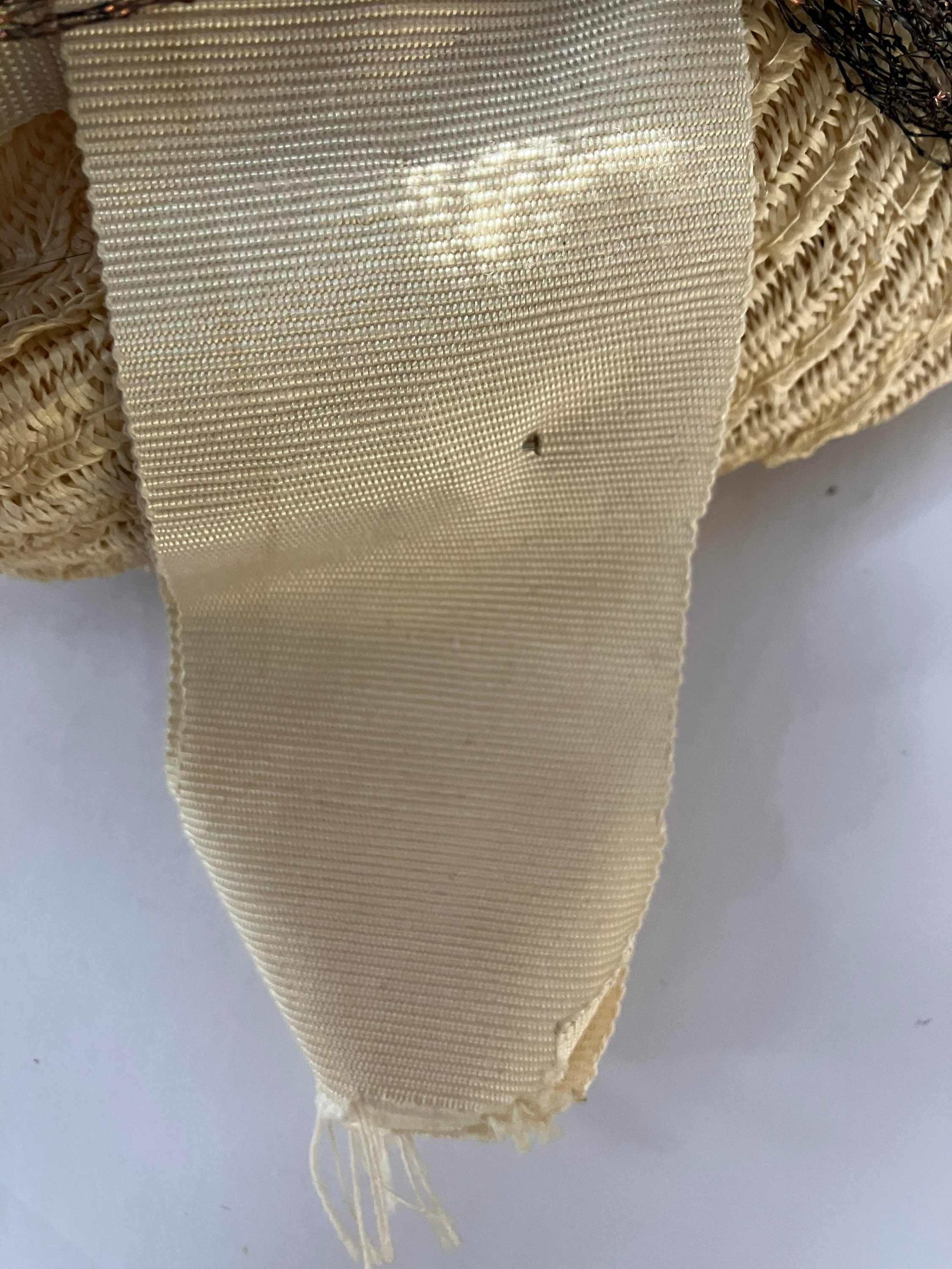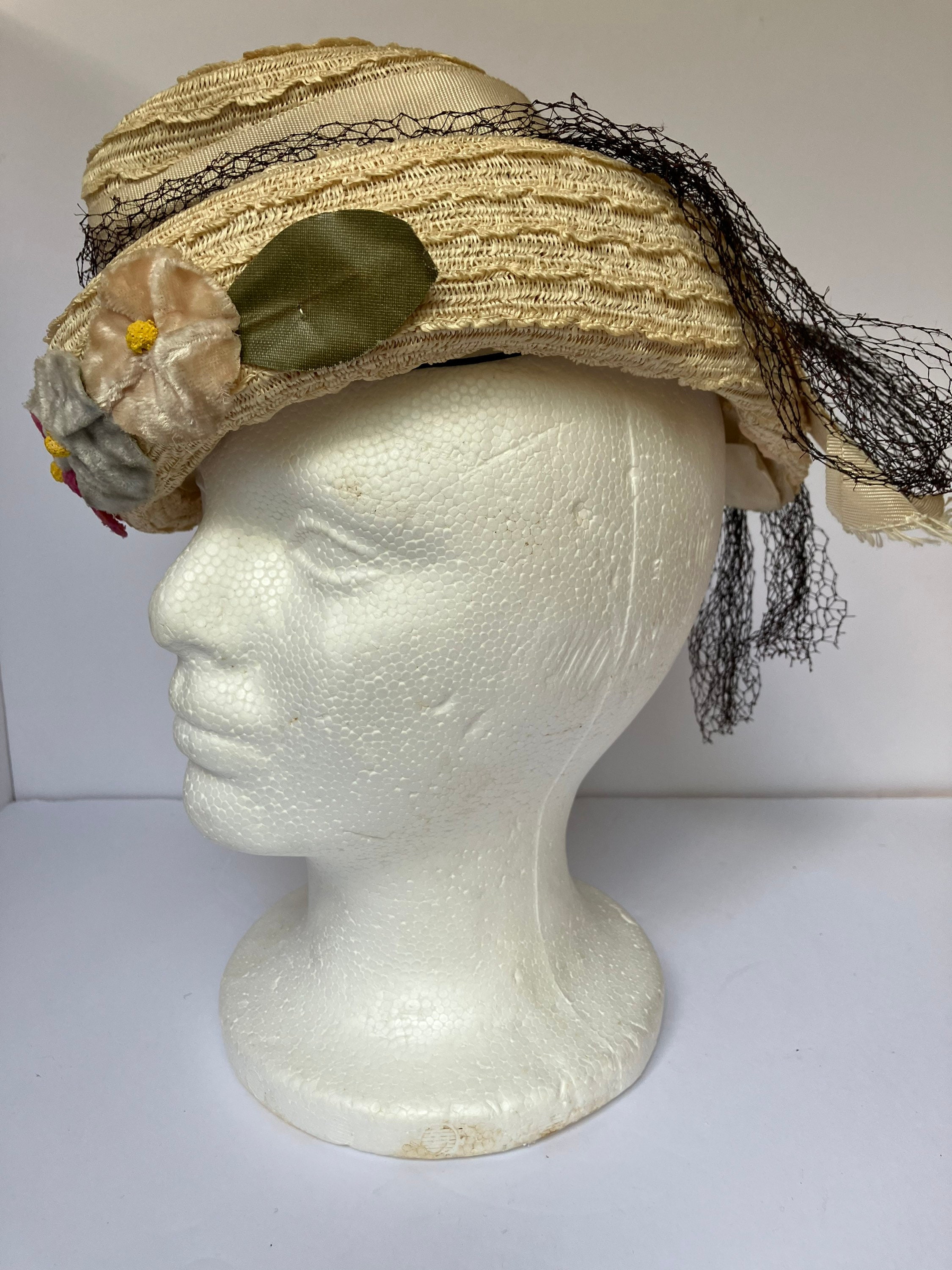 Condition: Good vintage condition. There are holes in the netting but the hat is in otherwise very good condition. There is some light fraying to the ribbon trim at the end. (Please see photos).