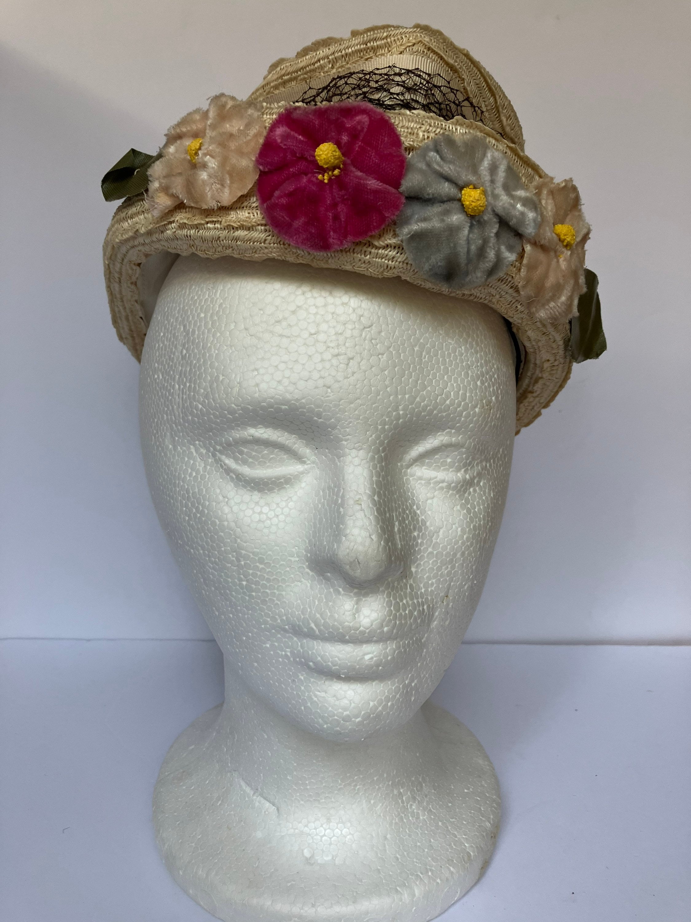 The perfect Easter bonnet! This listing is for a c. 1940s "Carol Brent Classic" straw tilt hat. Carol Brent was a house label of the Montgomery Ward mail order company. This hat has the most fabulous shape and is meant to sit at a jaunty angle on the top of the head. It is darling! It has a ribbon trim and floral embellishment. The hat is in great condition but there are holes in the veil. has an attached elastic band.
