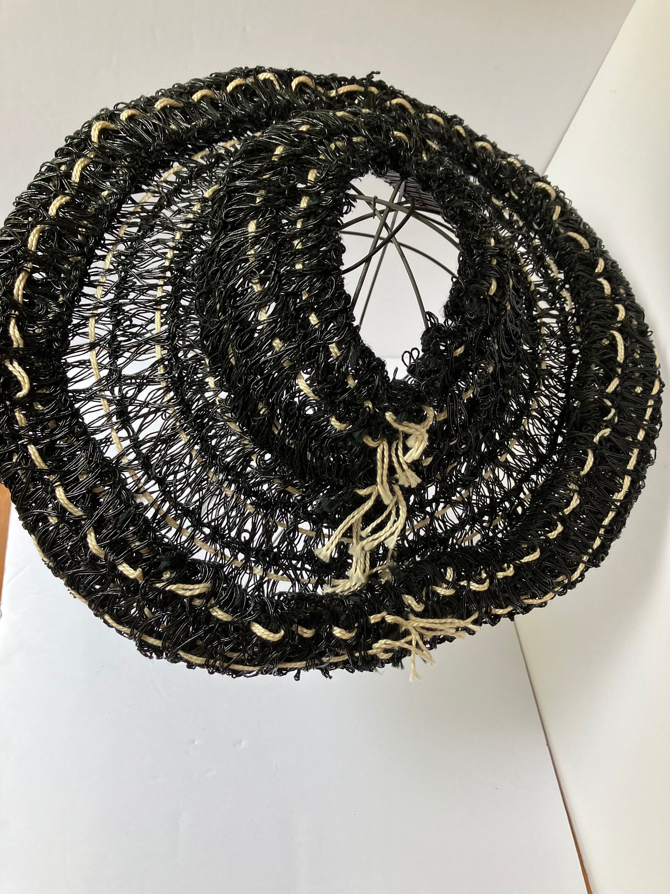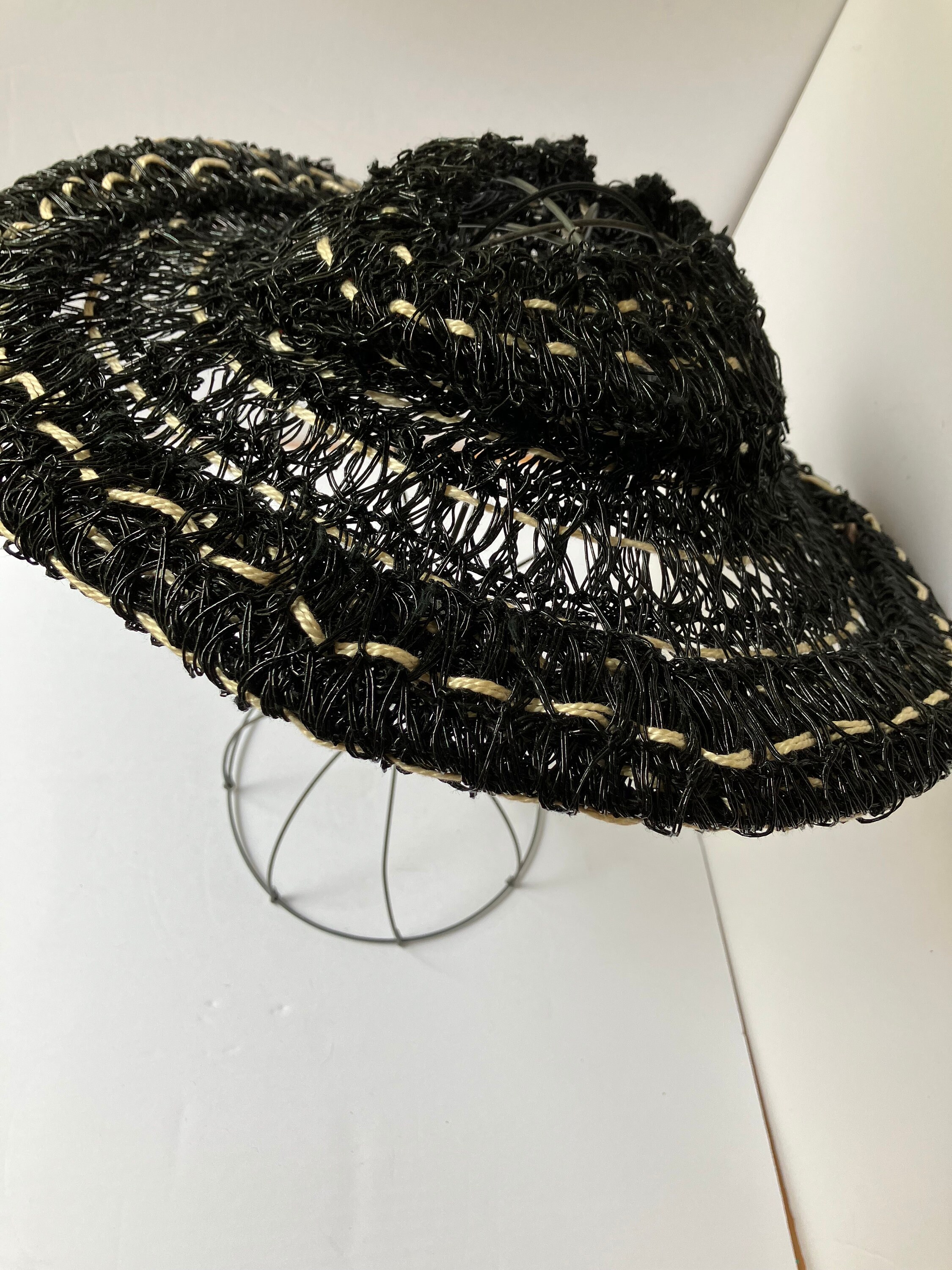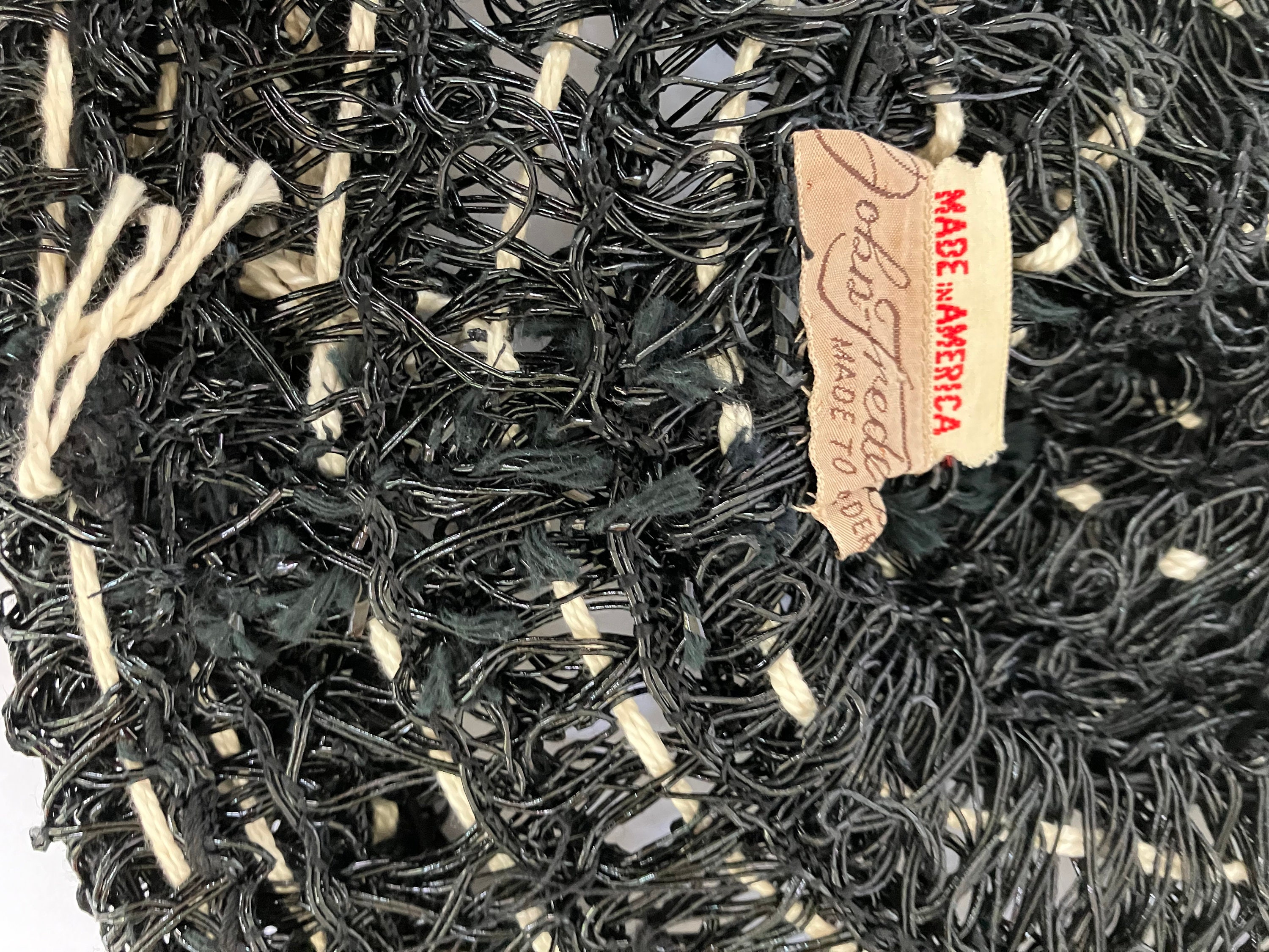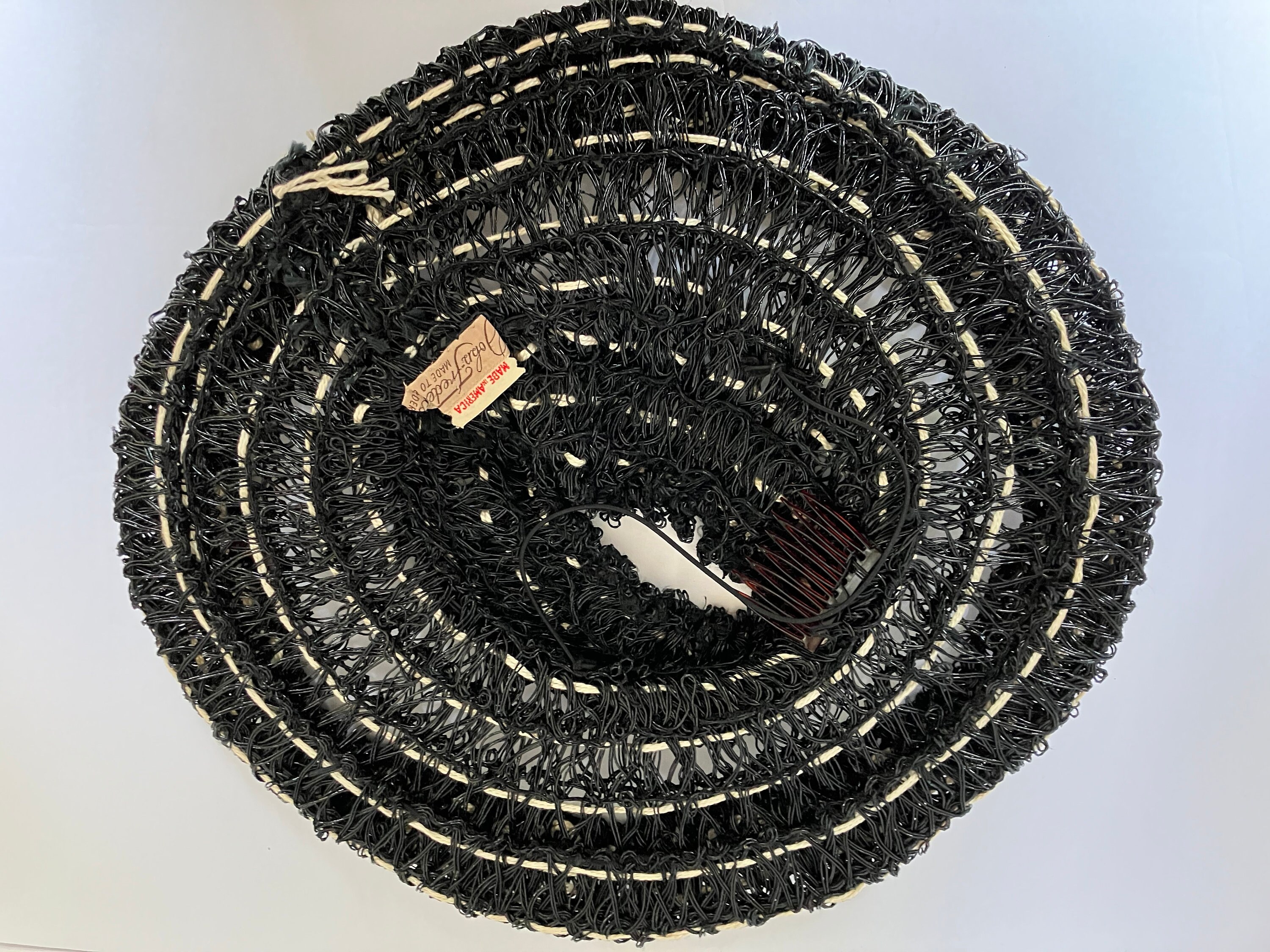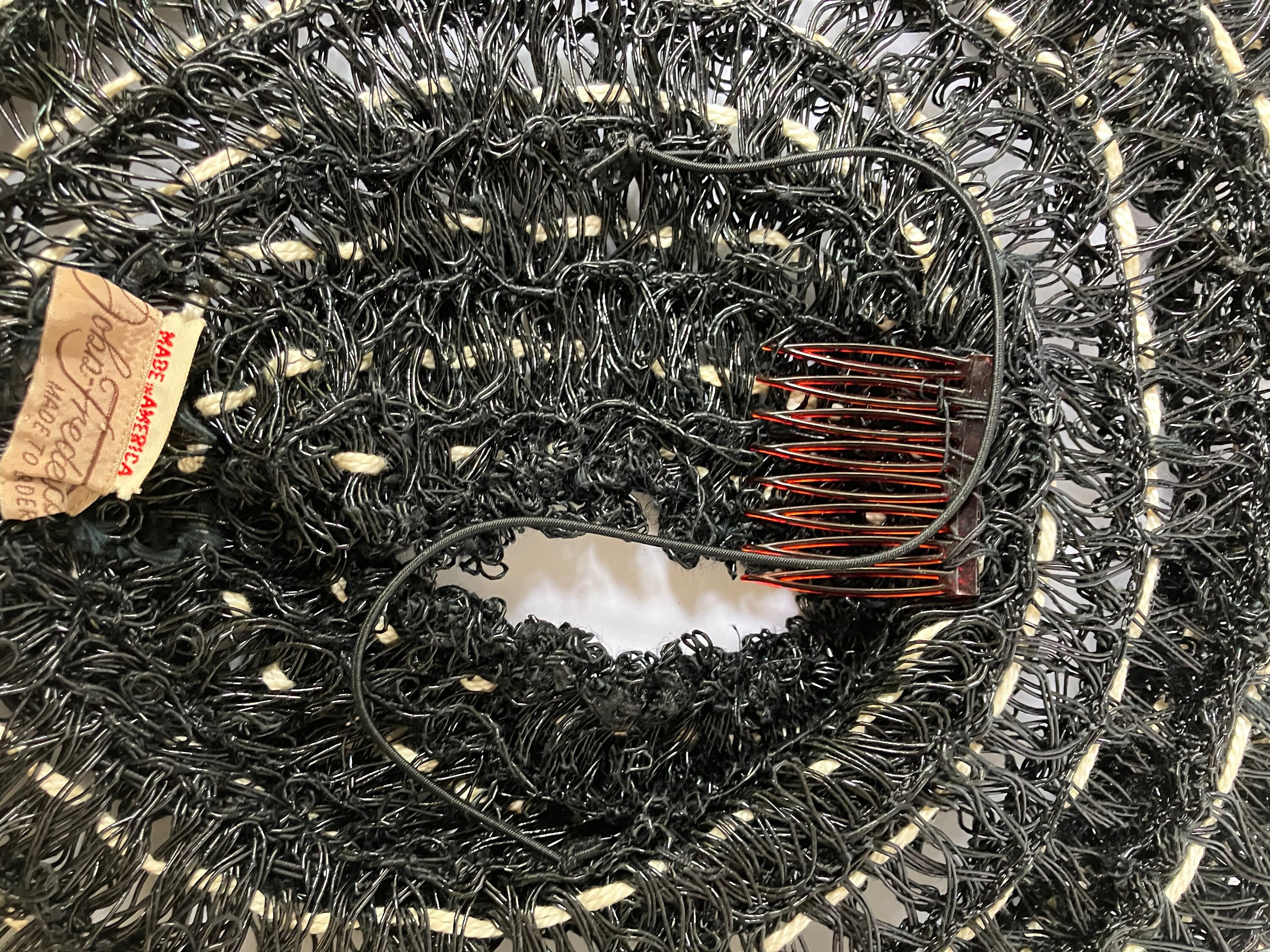 This listing is for a museum quality c. 1940s John Frederics Made to Order hat. It is made of glossy black woven material and off-white yarn/twine. It has an open crown, a hair comb, and elastic strap. It is in excellent condition. This is a special piece. The tag says John Frederics Made to Order & Made in America.
