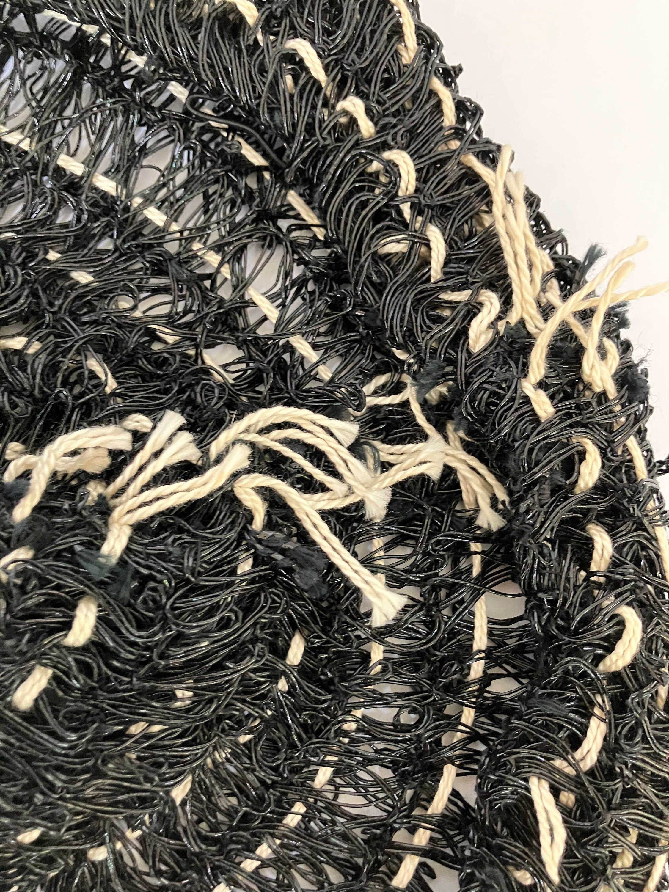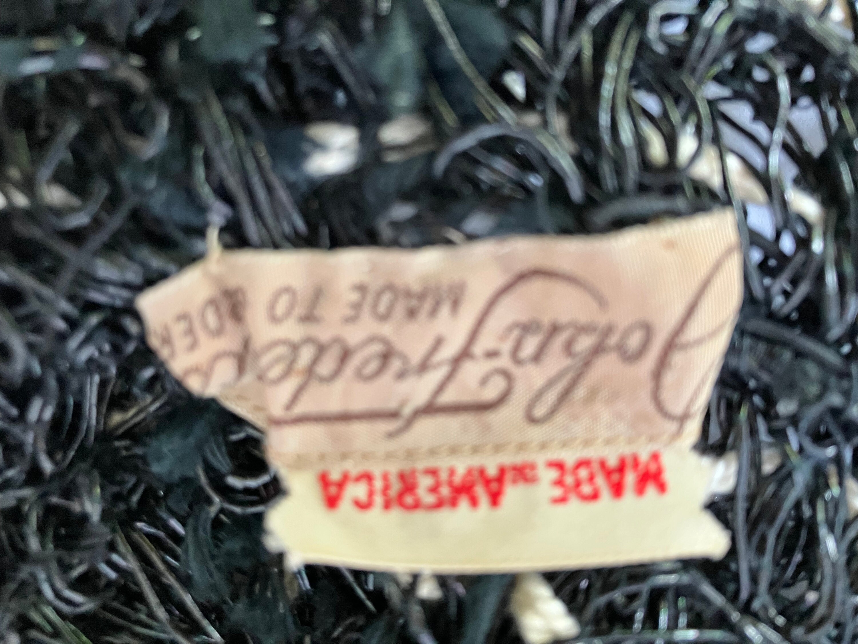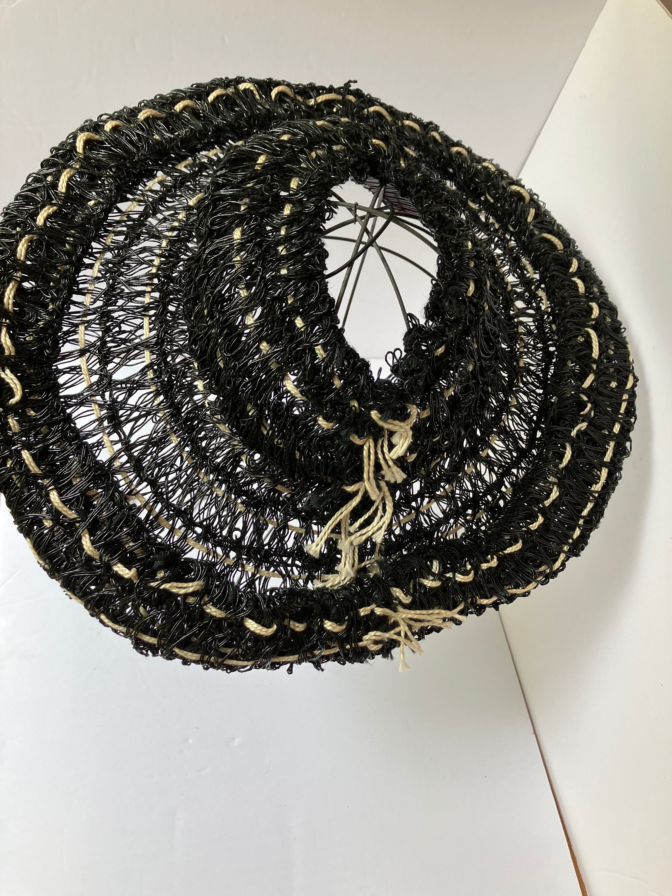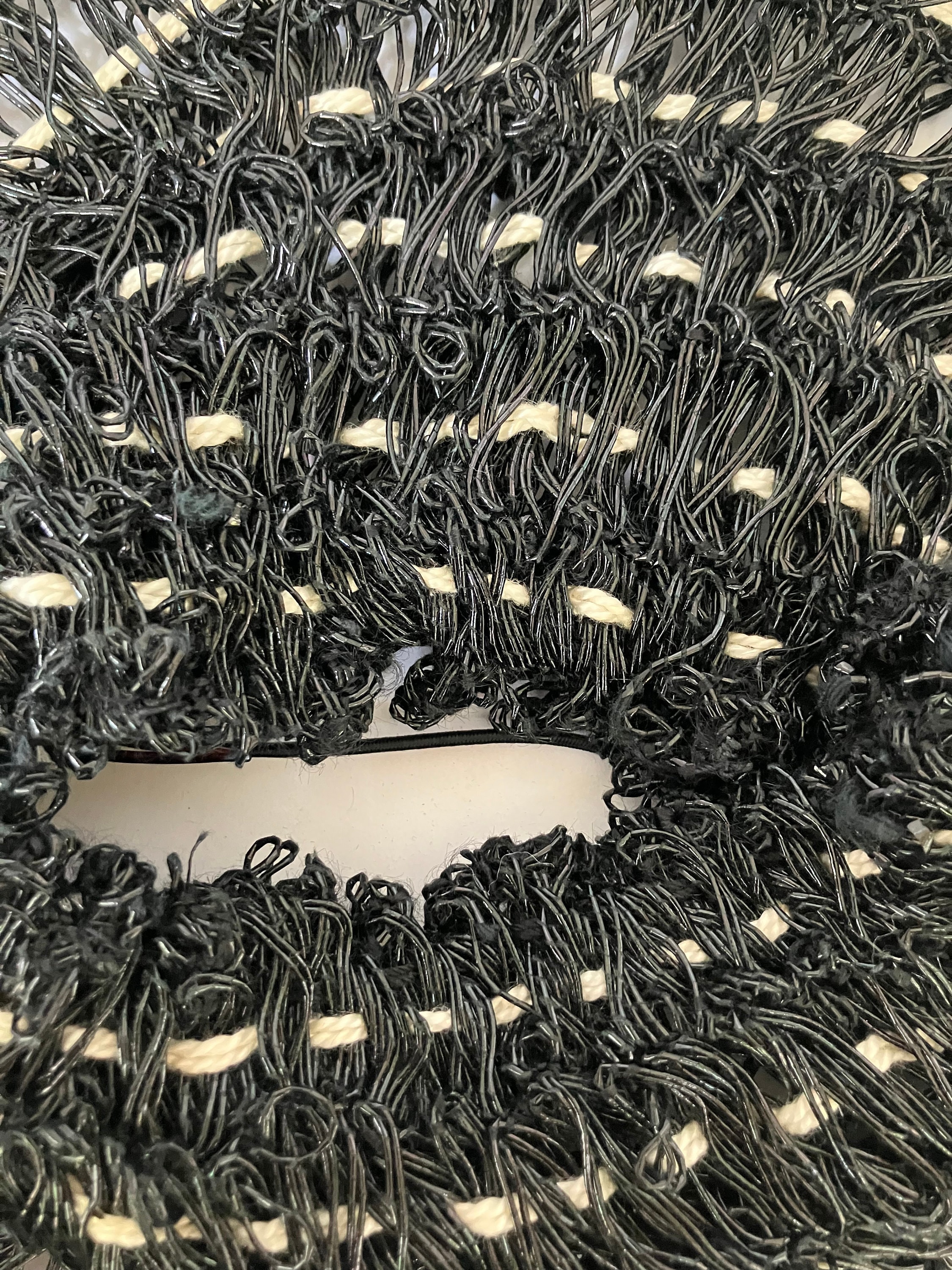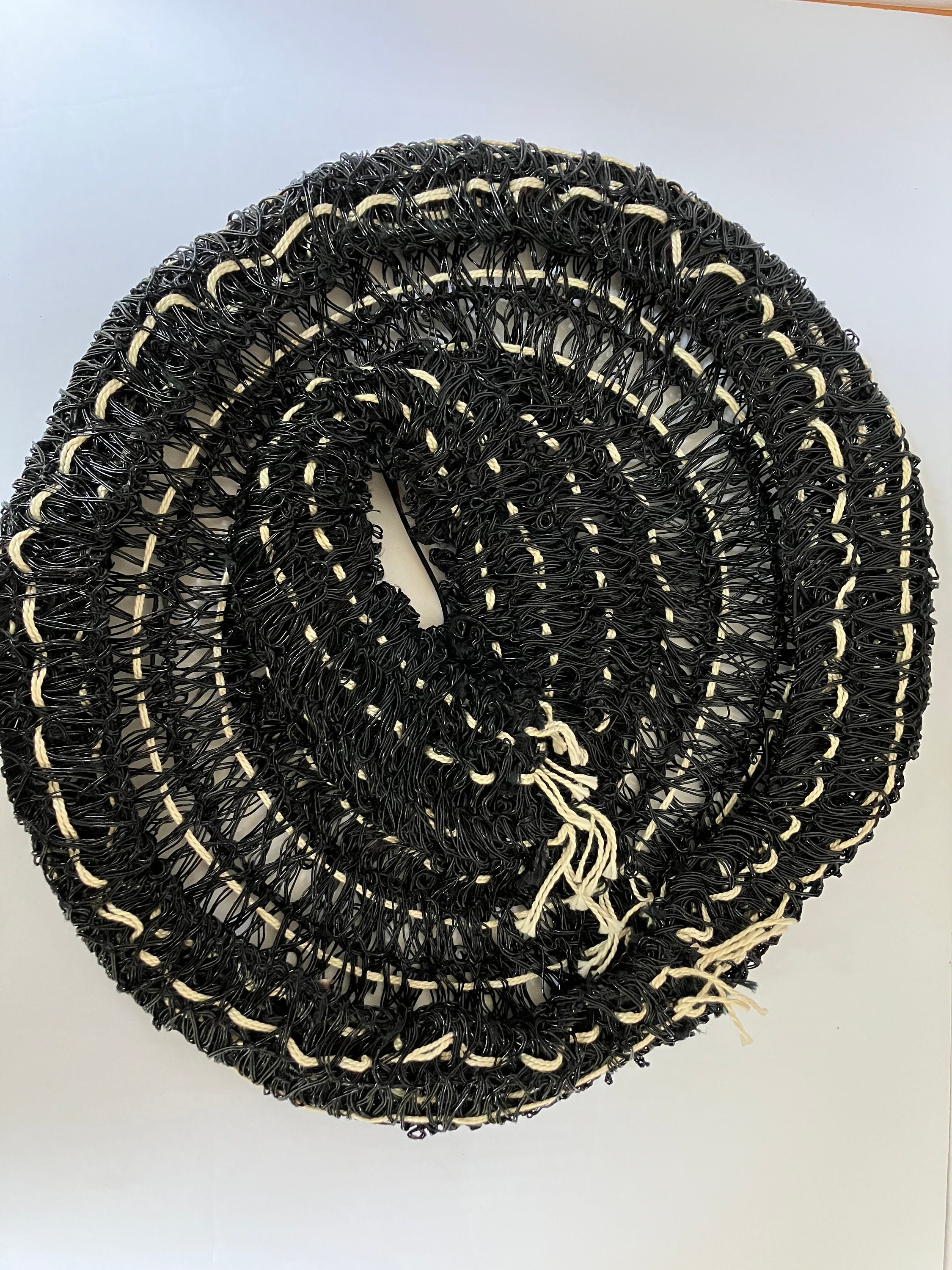 This listing is for a museum quality c. 1940s John Frederics Made to Order hat. It is made of glossy black woven material and off-white yarn/twine. It has an open crown, a hair comb, and elastic strap. It is in excellent condition. This is a special piece. The tag says John Frederics Made to Order & Made in America.