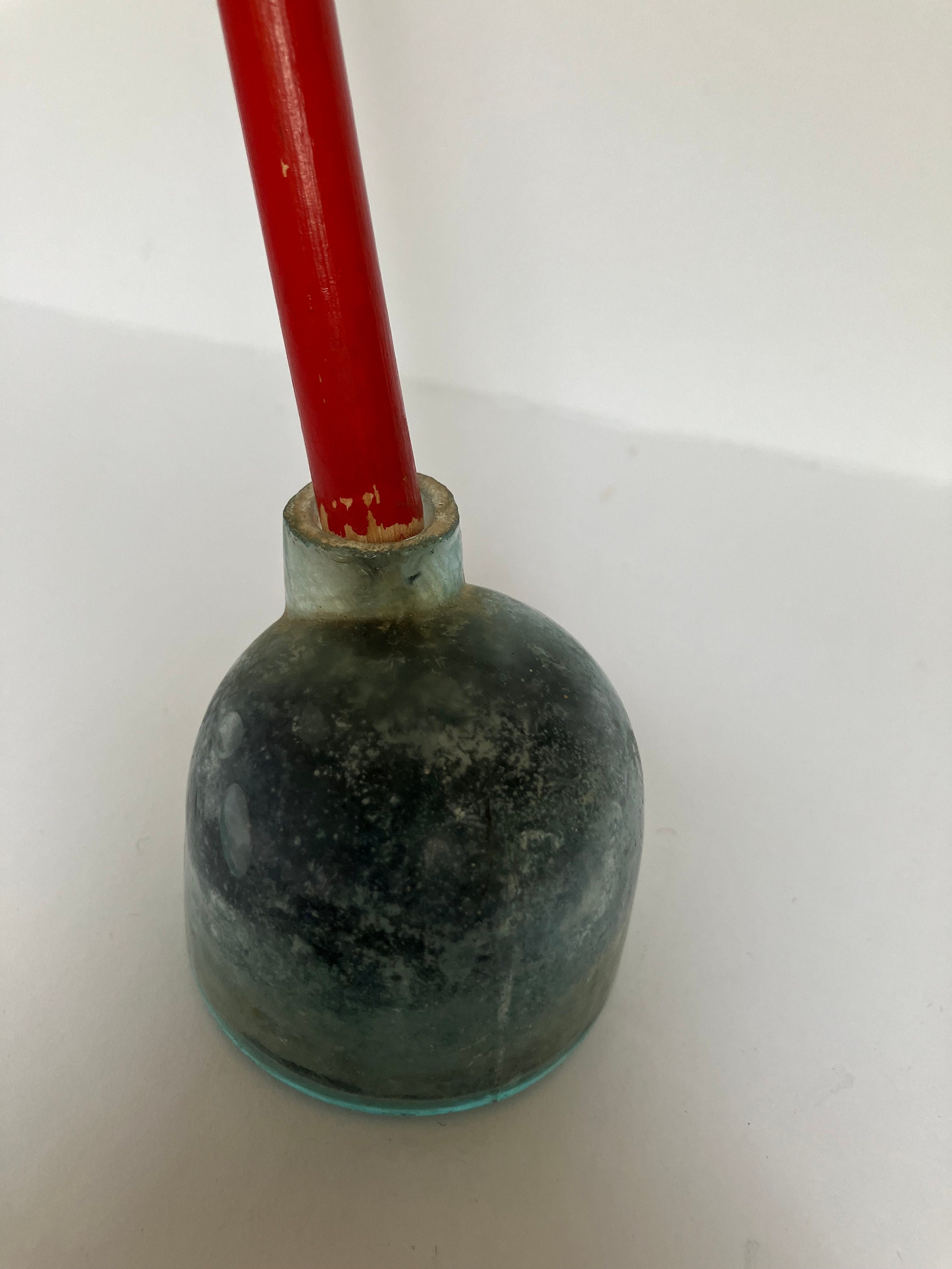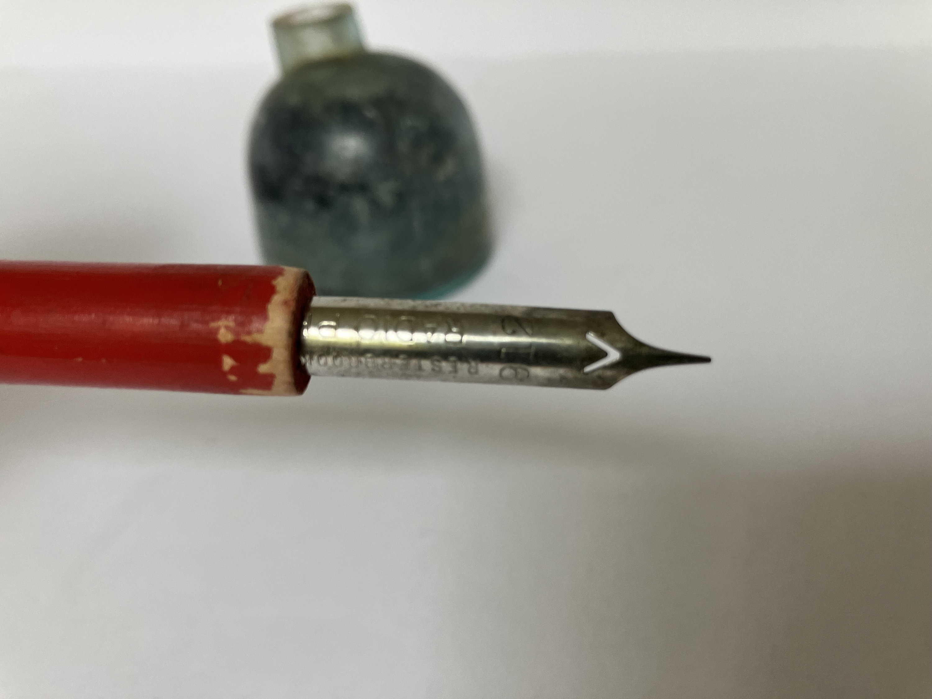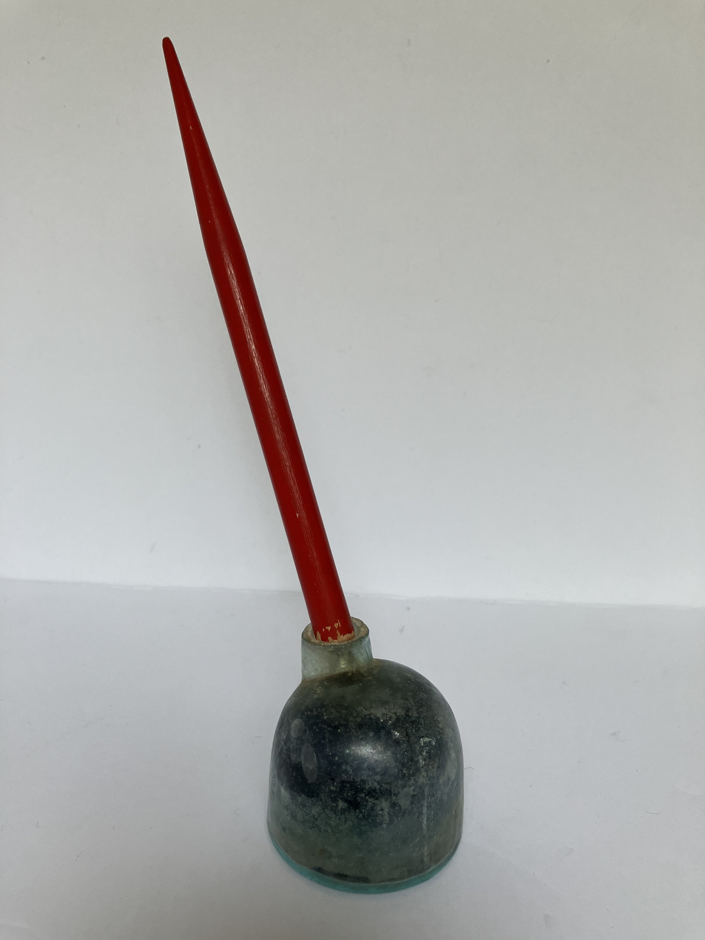 This listing is for an inkwell AND pen set. The inkwell/pen holder is antique blue-green glass. The pen is red wood with a Esterbrook Radio 912 pen nib.