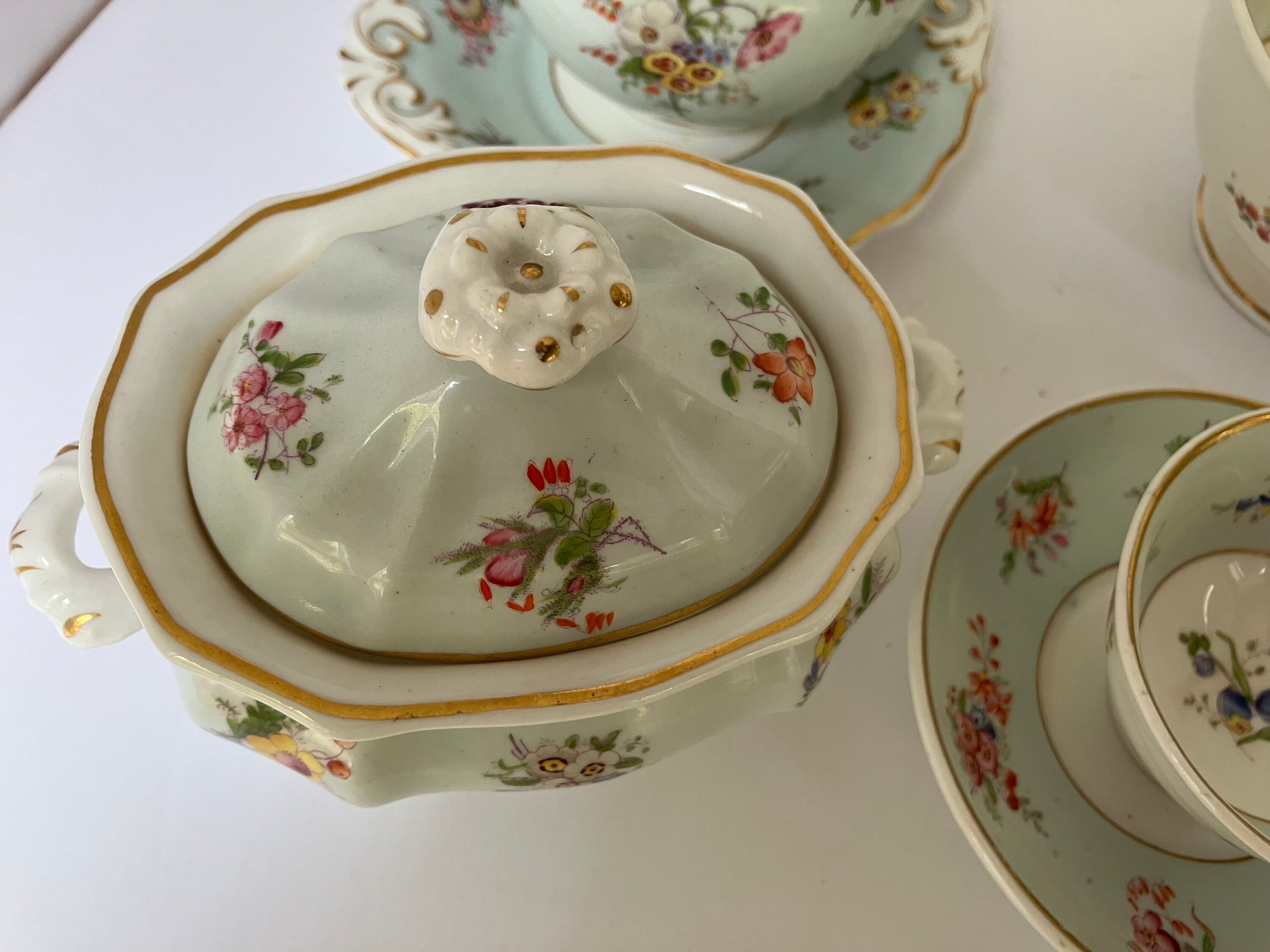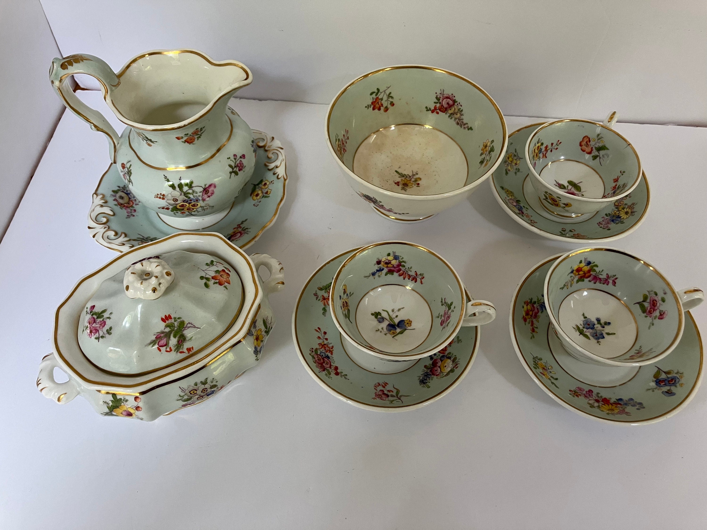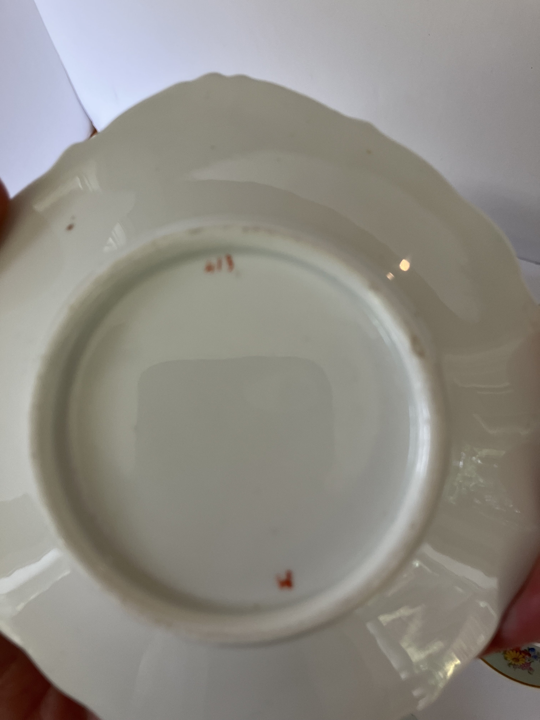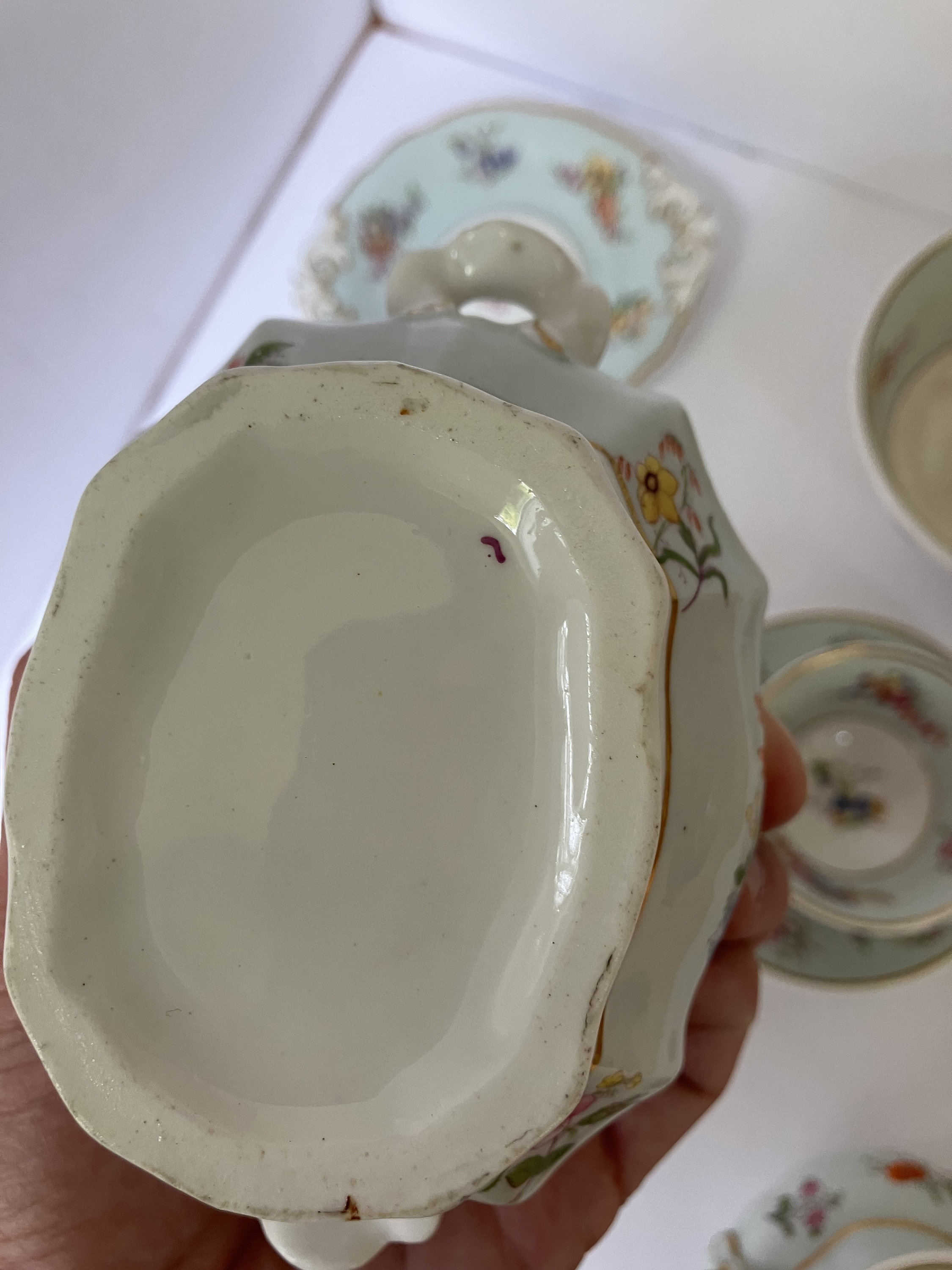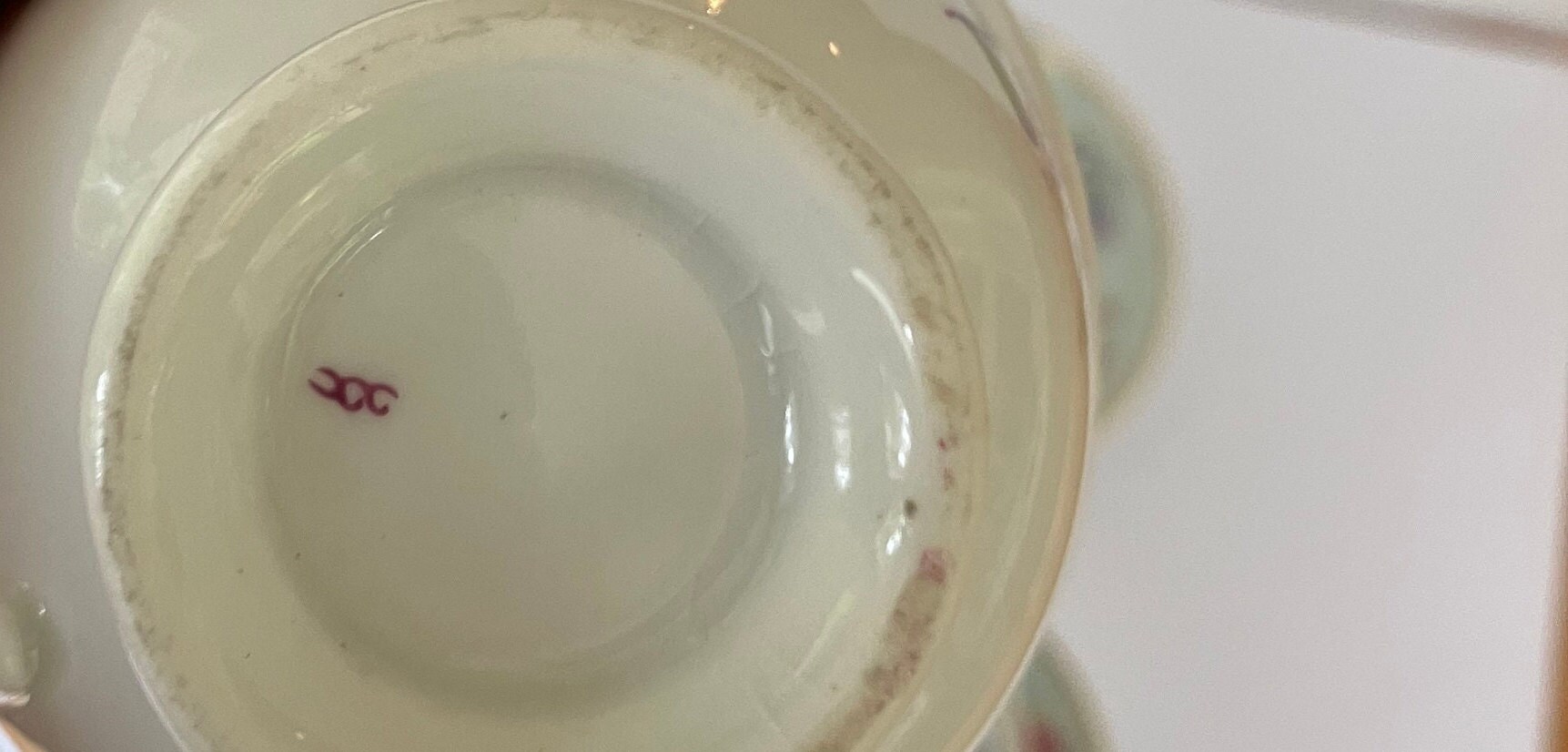 This listing is for an antique, possibly European, small hand-painted tea set. The decoration is reminiscent of Sevres style sets. It is likely 19th century china. The set includes three teacups and saucers, one creamer and base, one waste bowl, and one sugar bowl with lid. It is possibly part of a cabaret set or a toy or child's tea set. I wasn't able to determine the maker but there are cipher marks and numbers (pattern or mold numbers) on the bases of the china pieces.