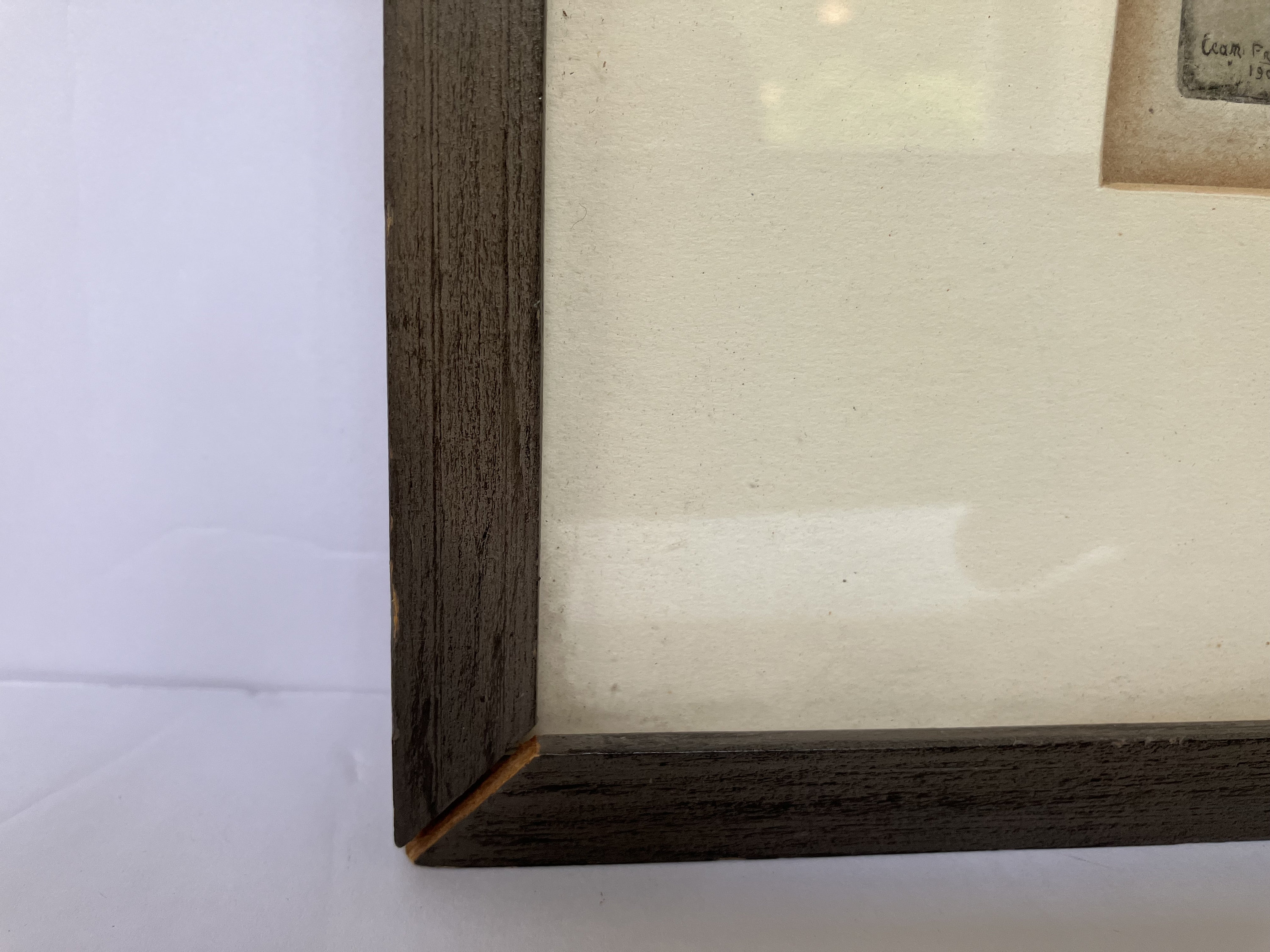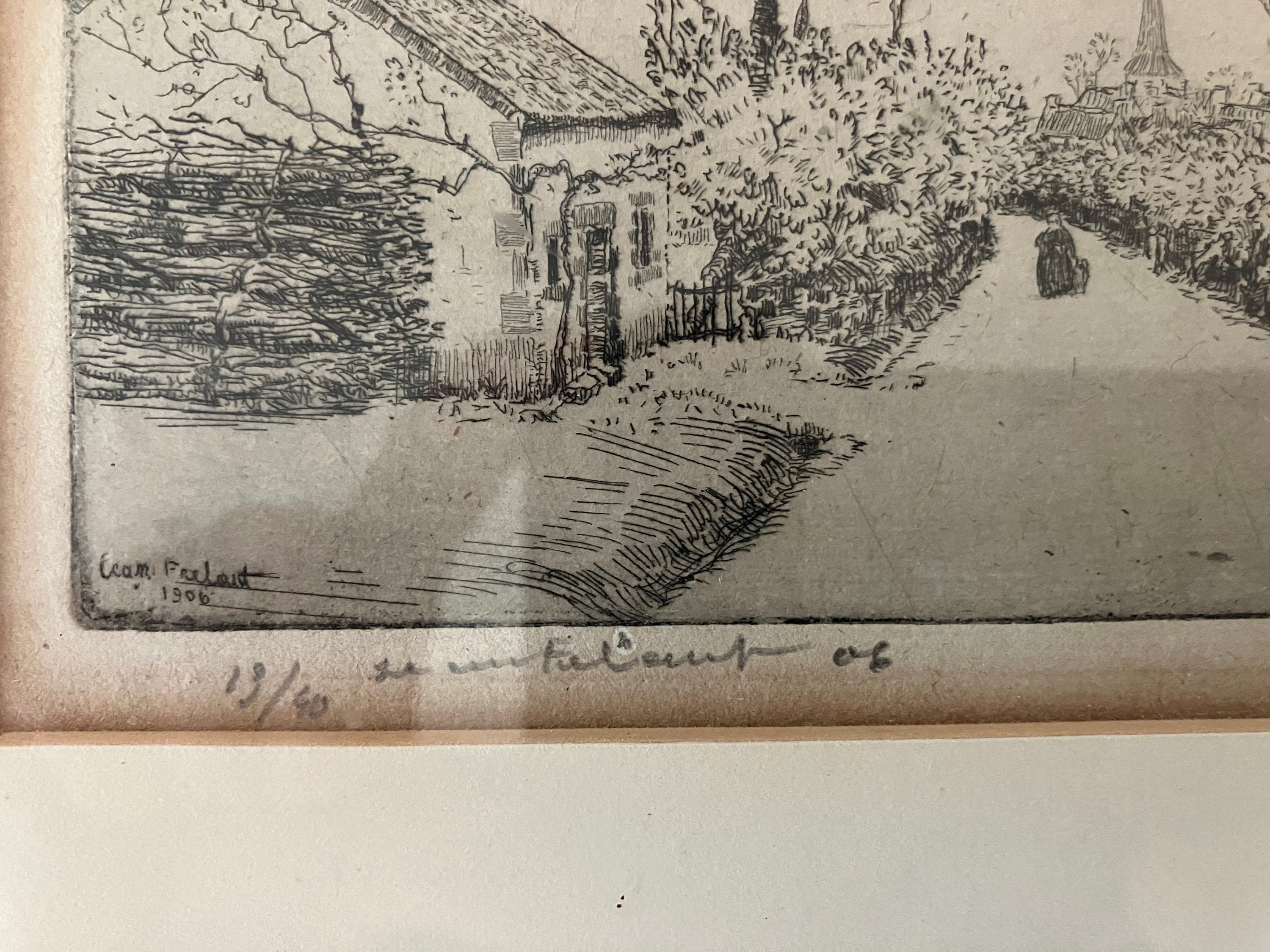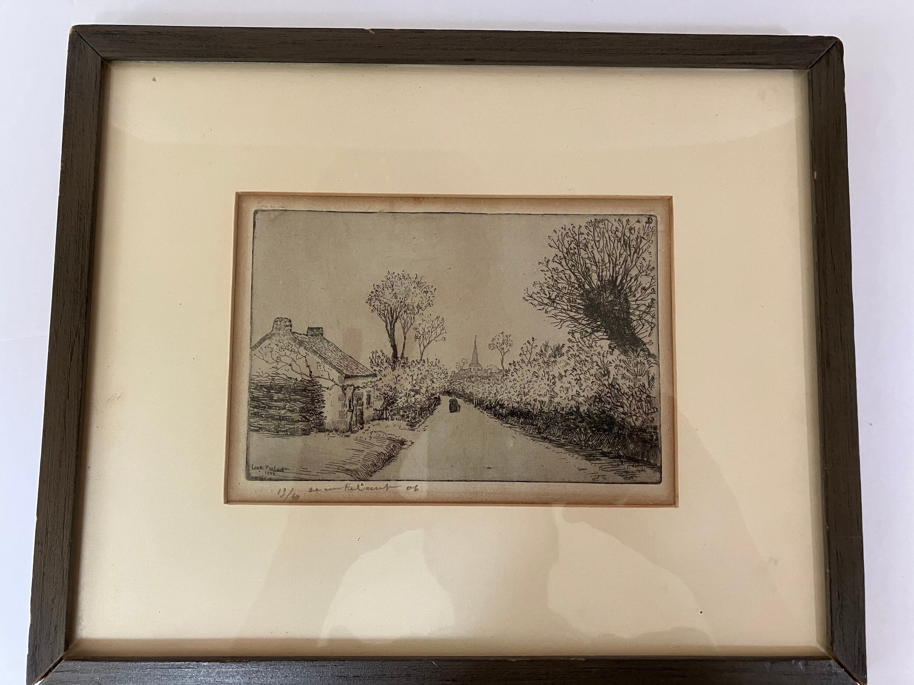 This listing is for a beautiful signed black and white Jean Frelaut engraving, dated 1906. Numbered 13/40. It is framed in a wood frame. The lower corners of the frame are slightly separated but are still attached.