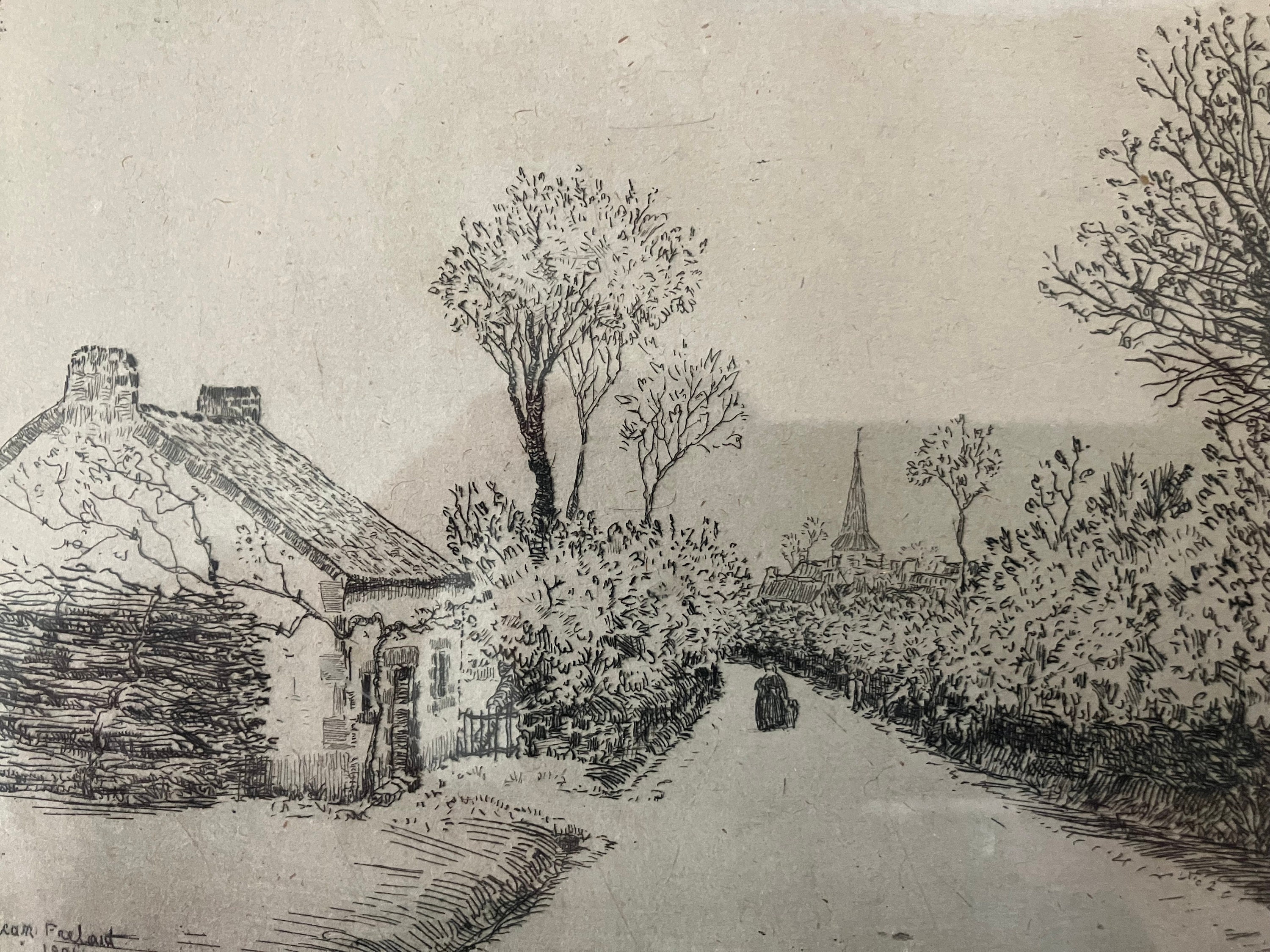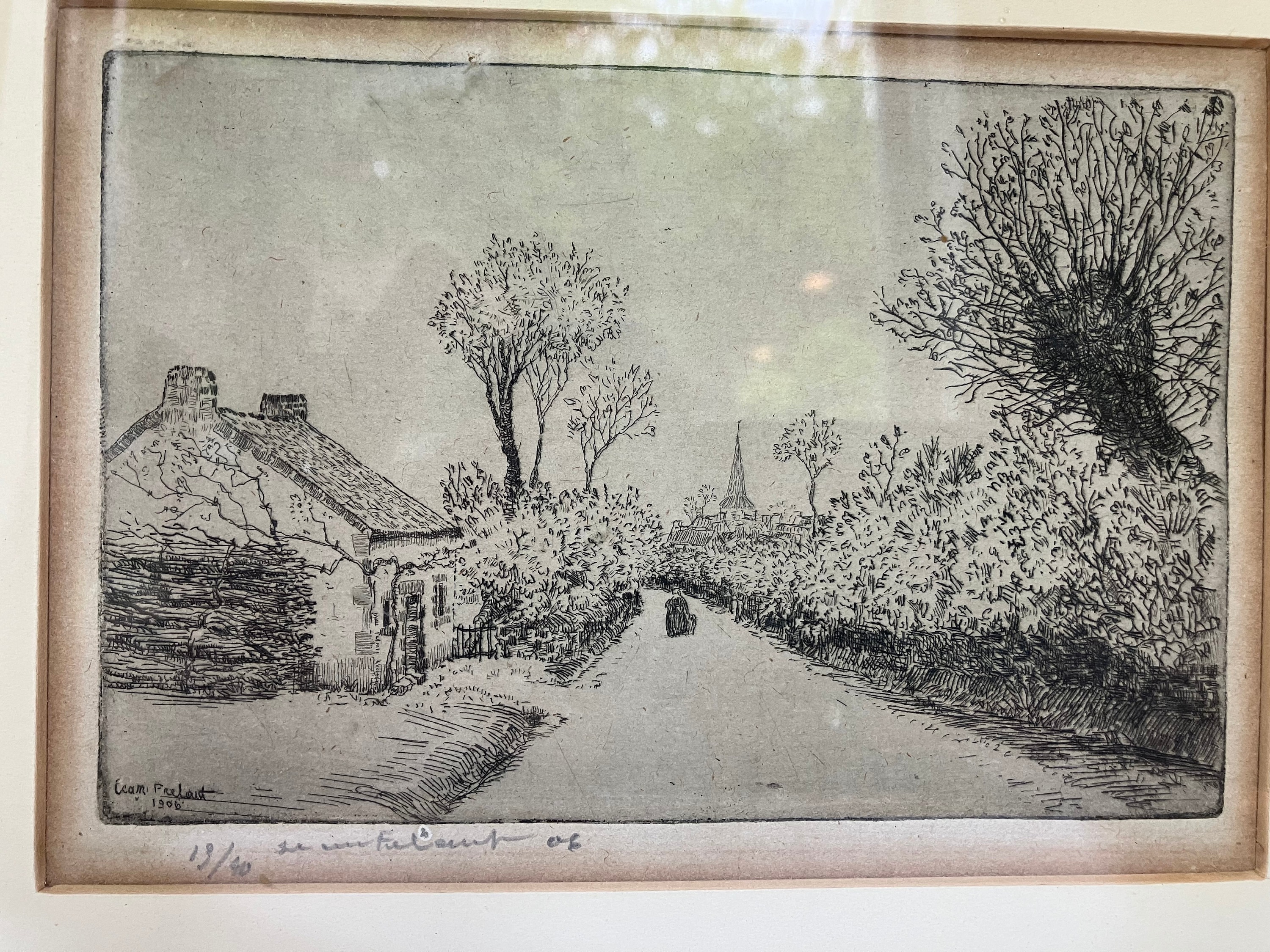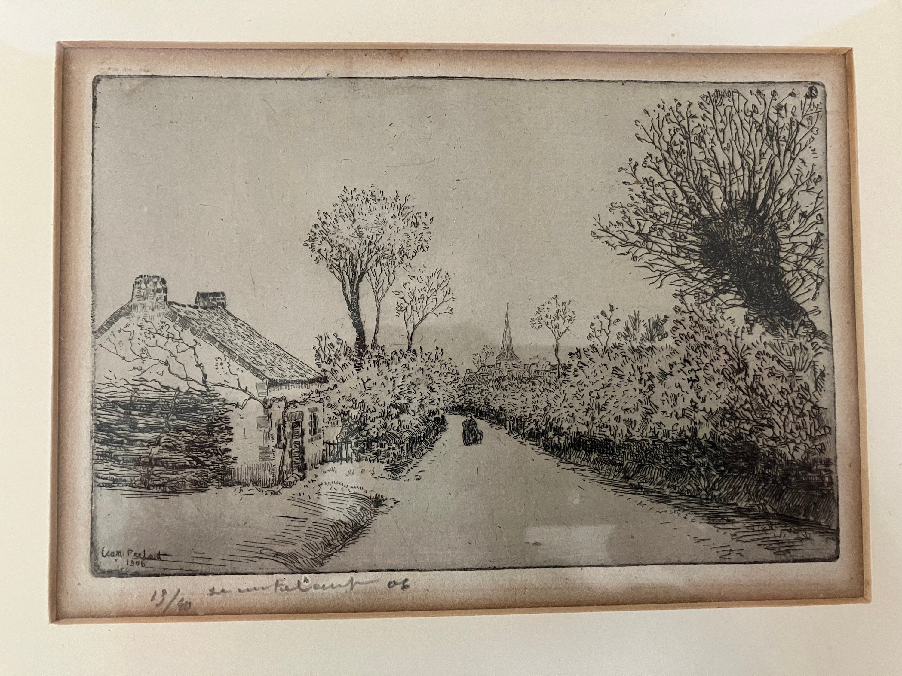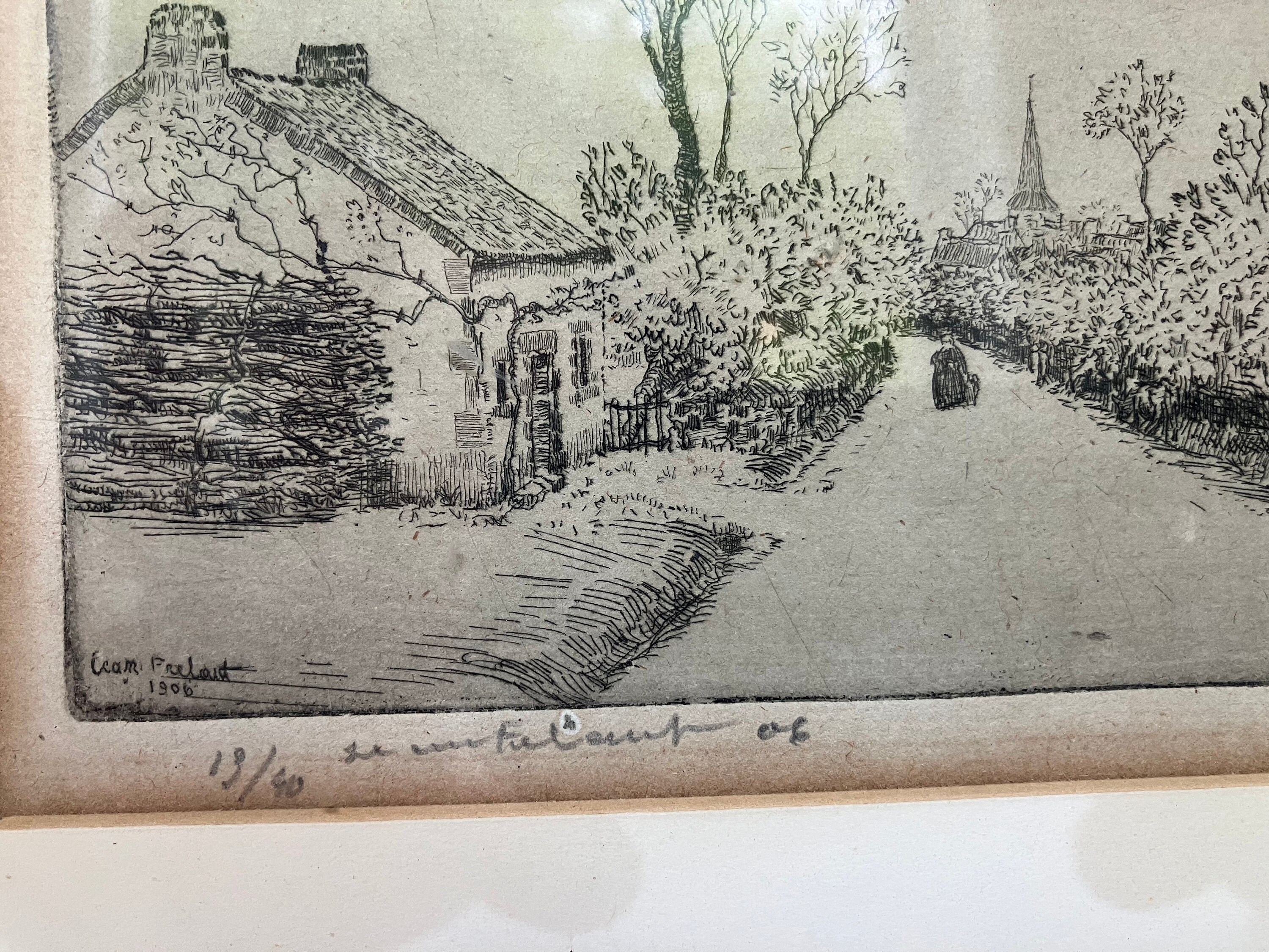 This listing is for a beautiful signed black and white Jean Frelaut engraving, dated 1906. Numbered 13/40. It is framed in a wood frame. The lower corners of the frame are slightly separated but are still attached.