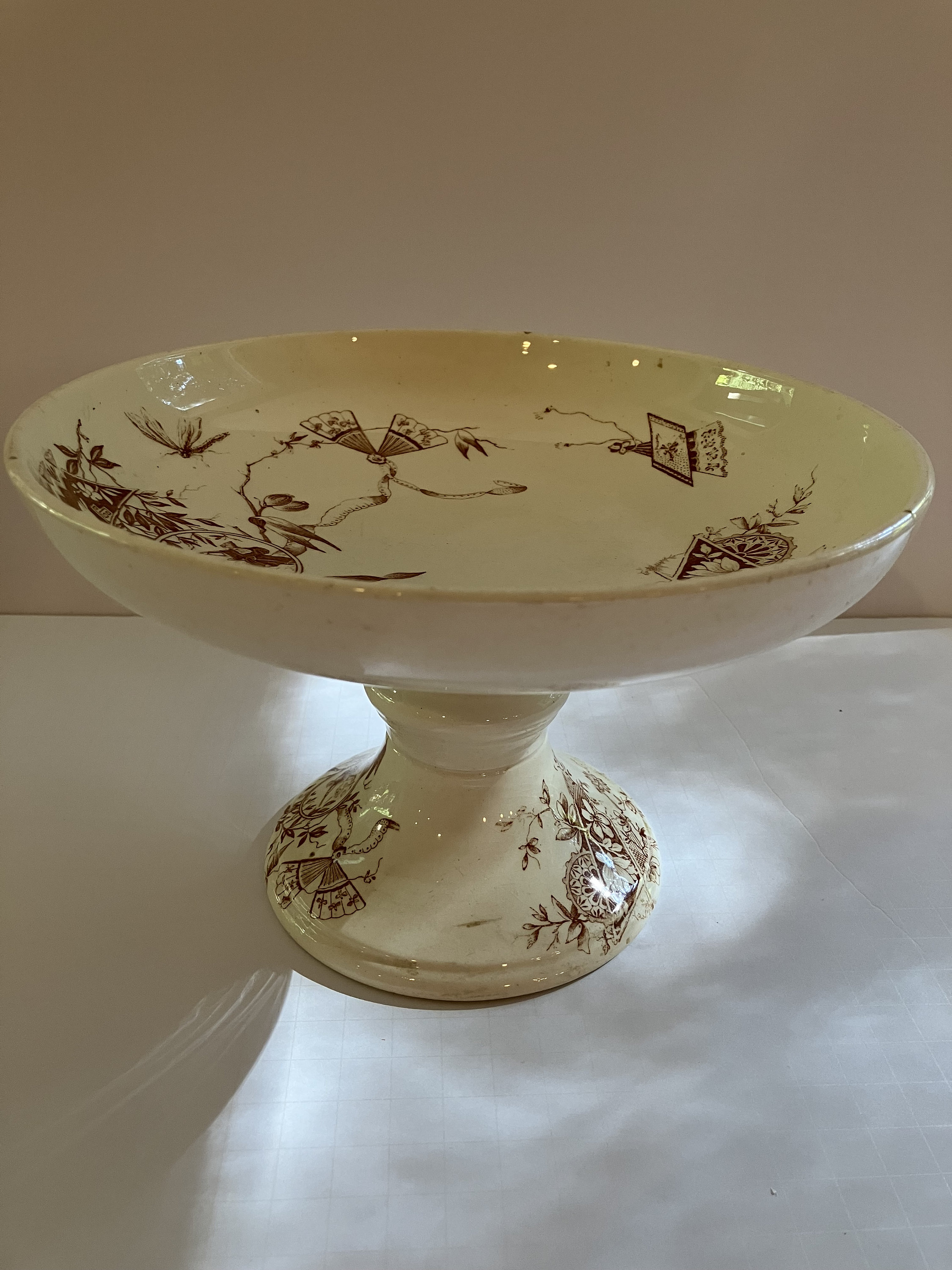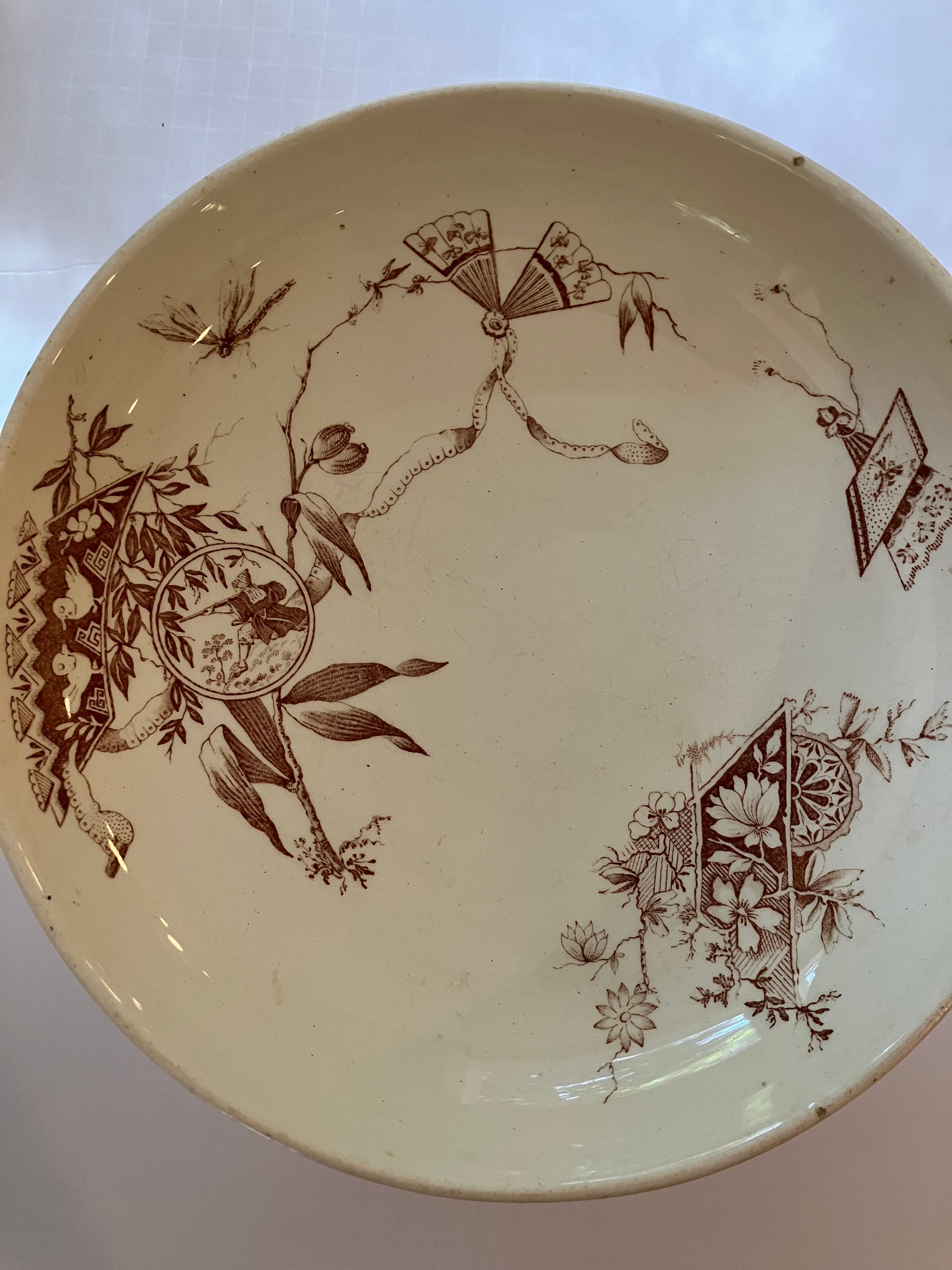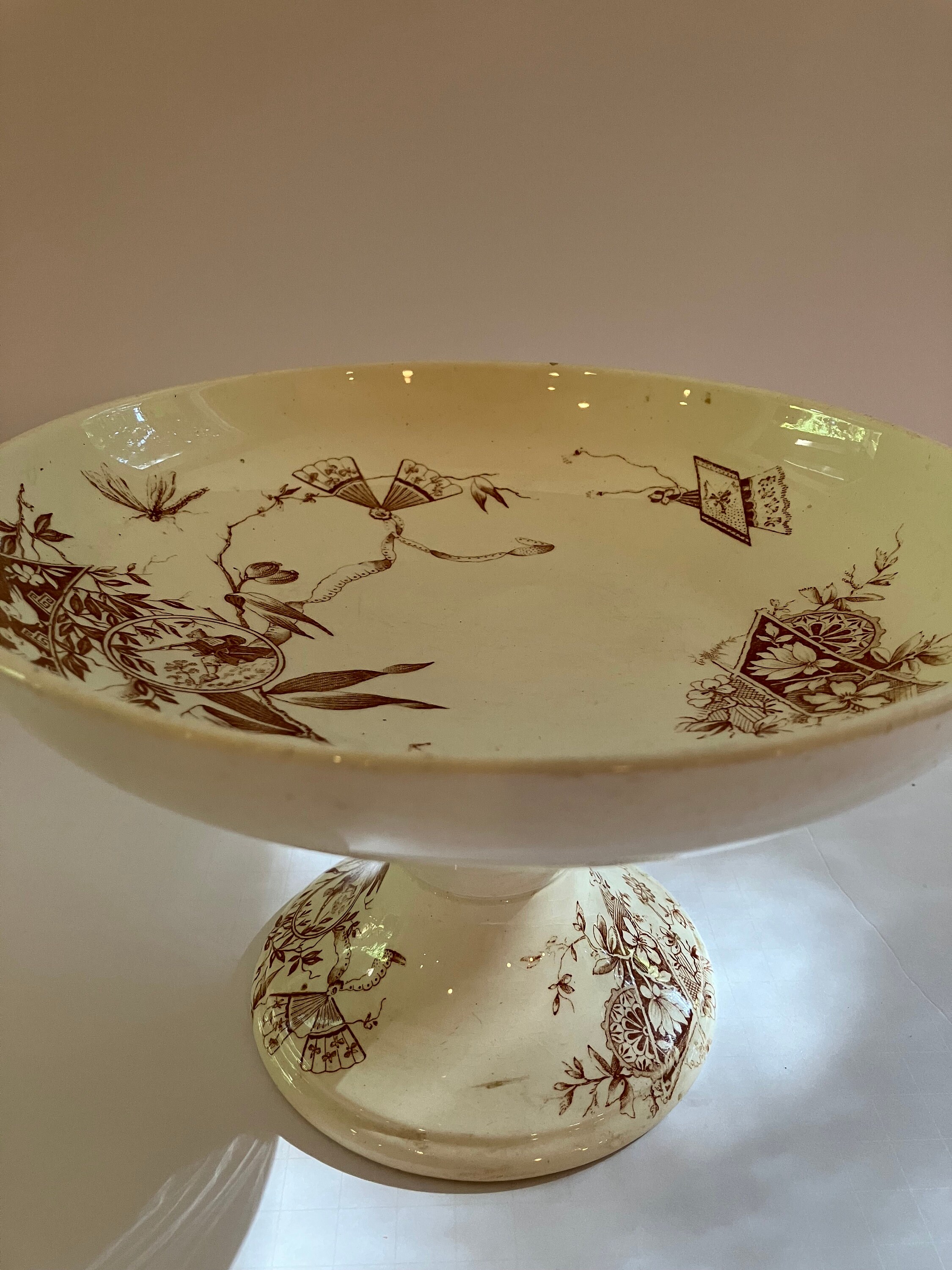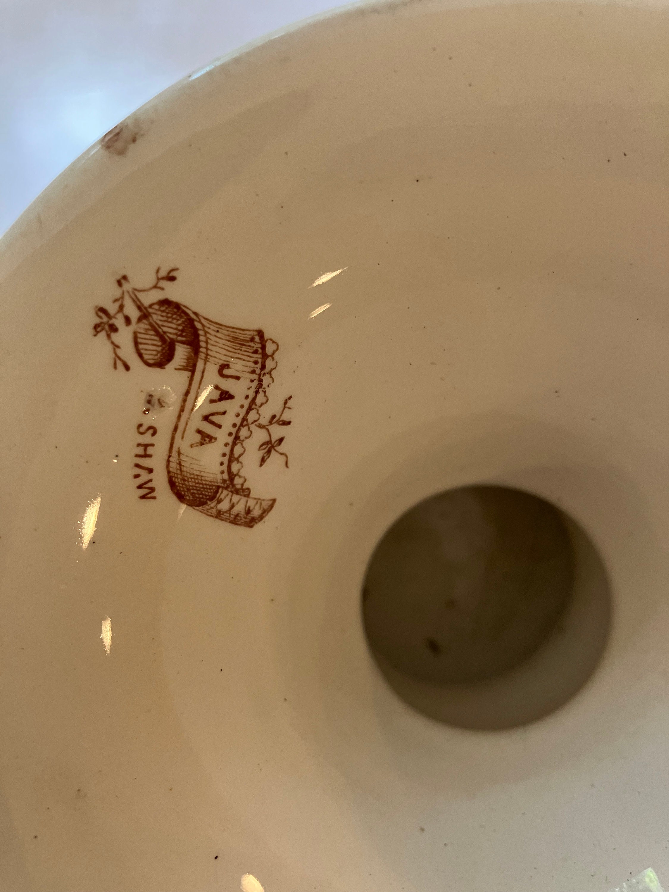 This listing is for a gorgeous antique Shaw "Java" pattern aesthetic movement brown transferware ironstone footed pedestal bowl. It is marked "Shaw Java" on the bottom.
