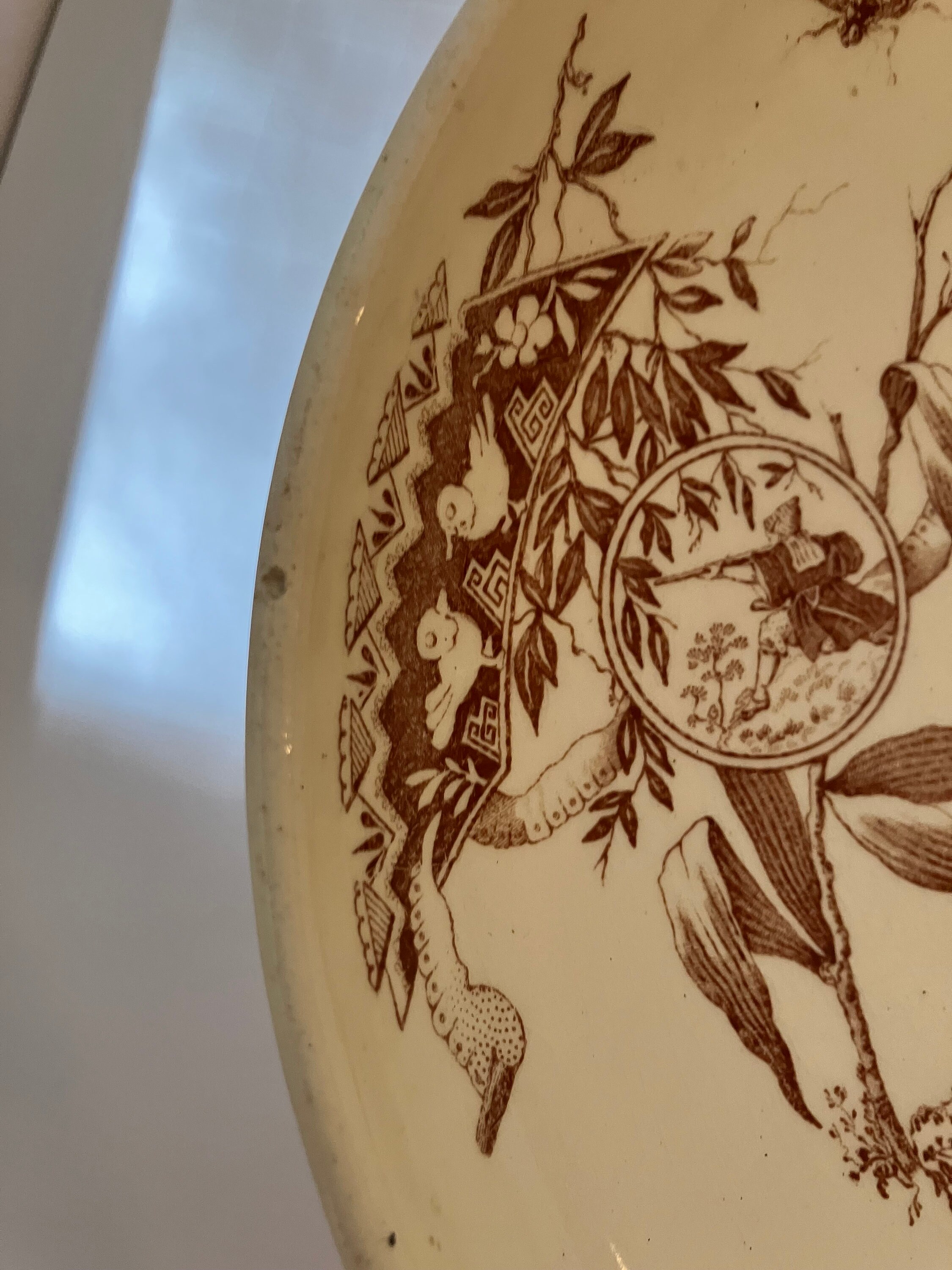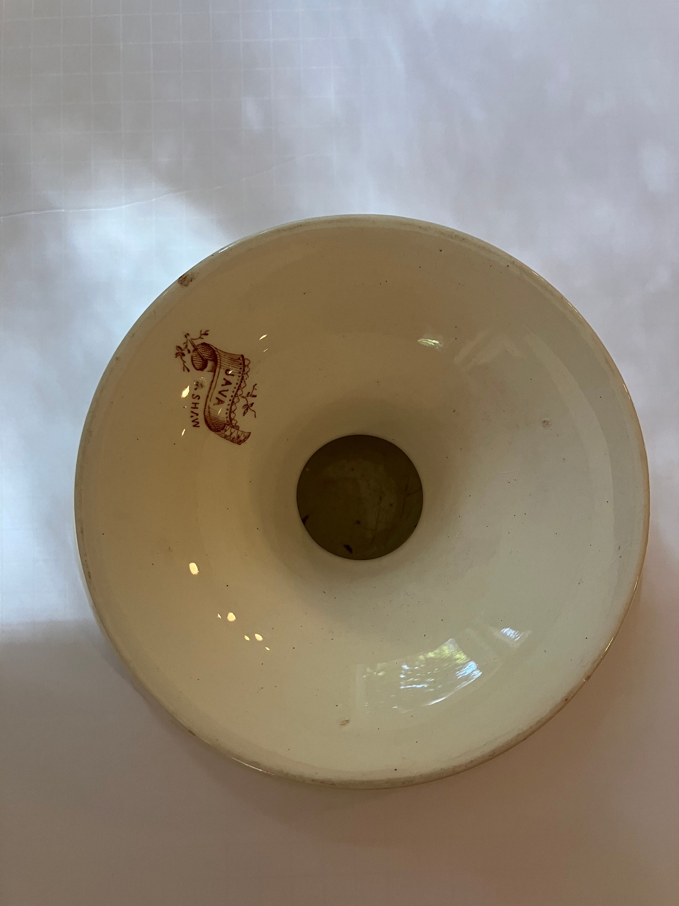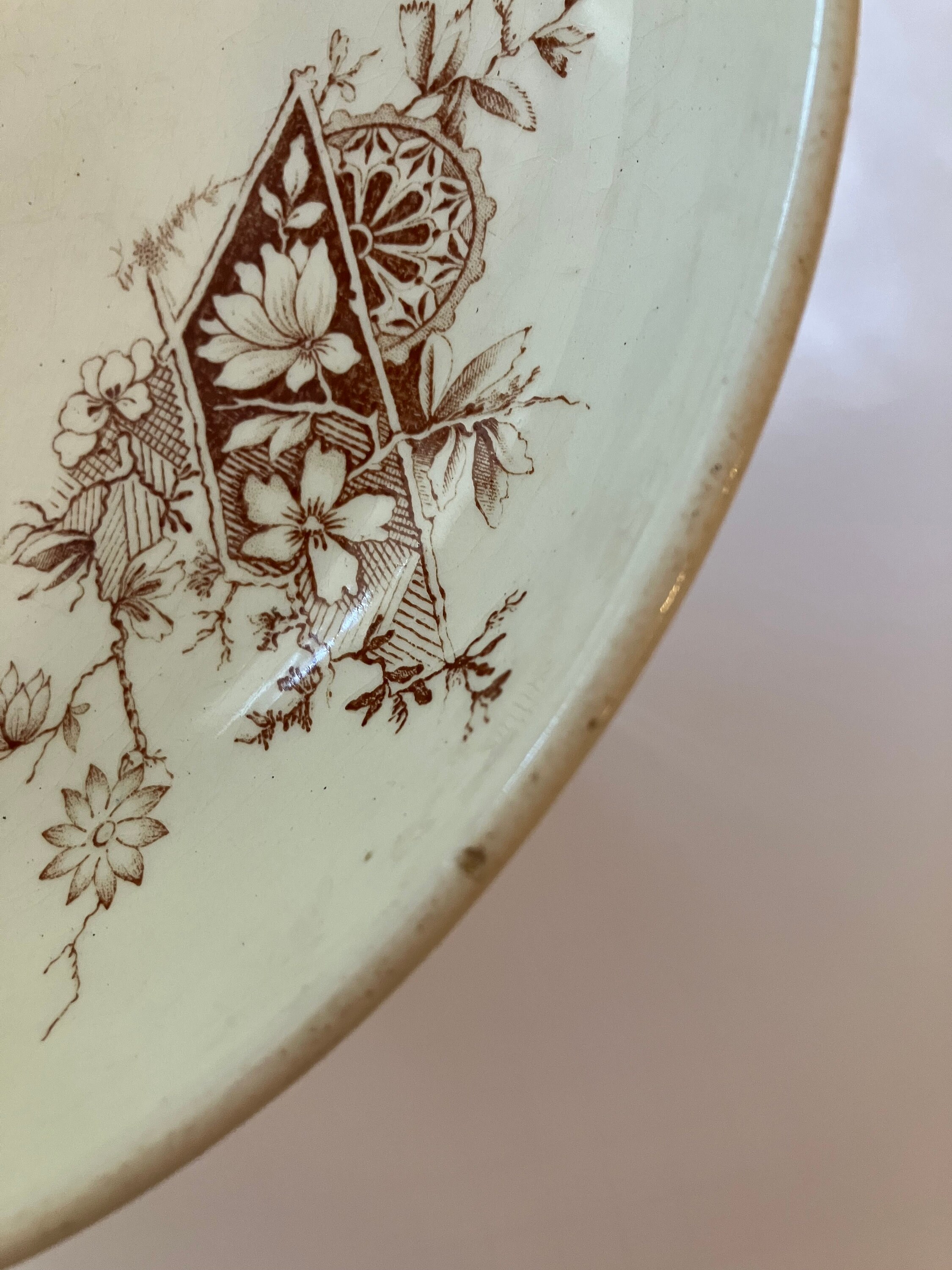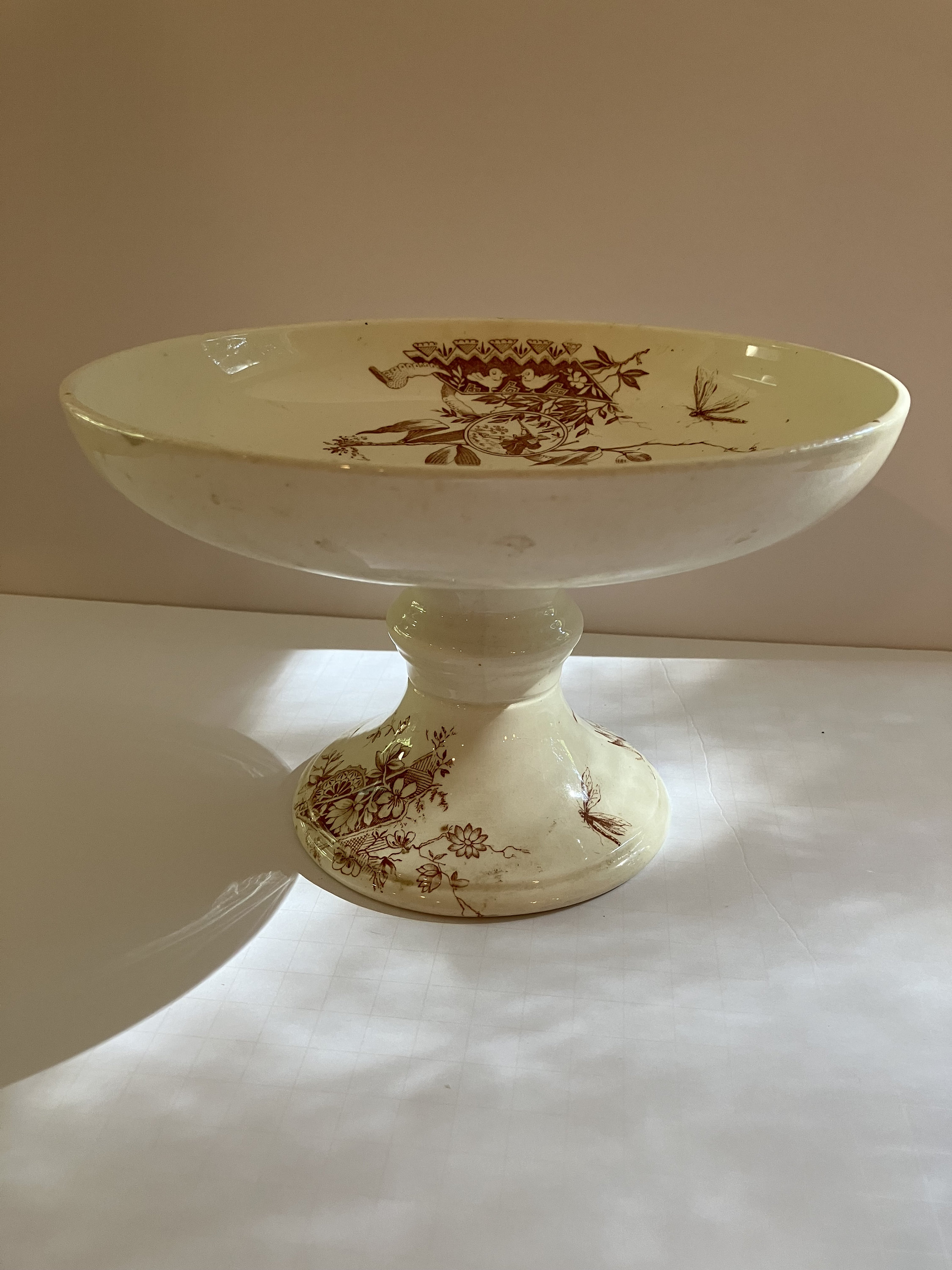 This listing is for a gorgeous antique Shaw "Java" pattern aesthetic movement brown transferware ironstone footed pedestal bowl. It is marked "Shaw Java" on the bottom.