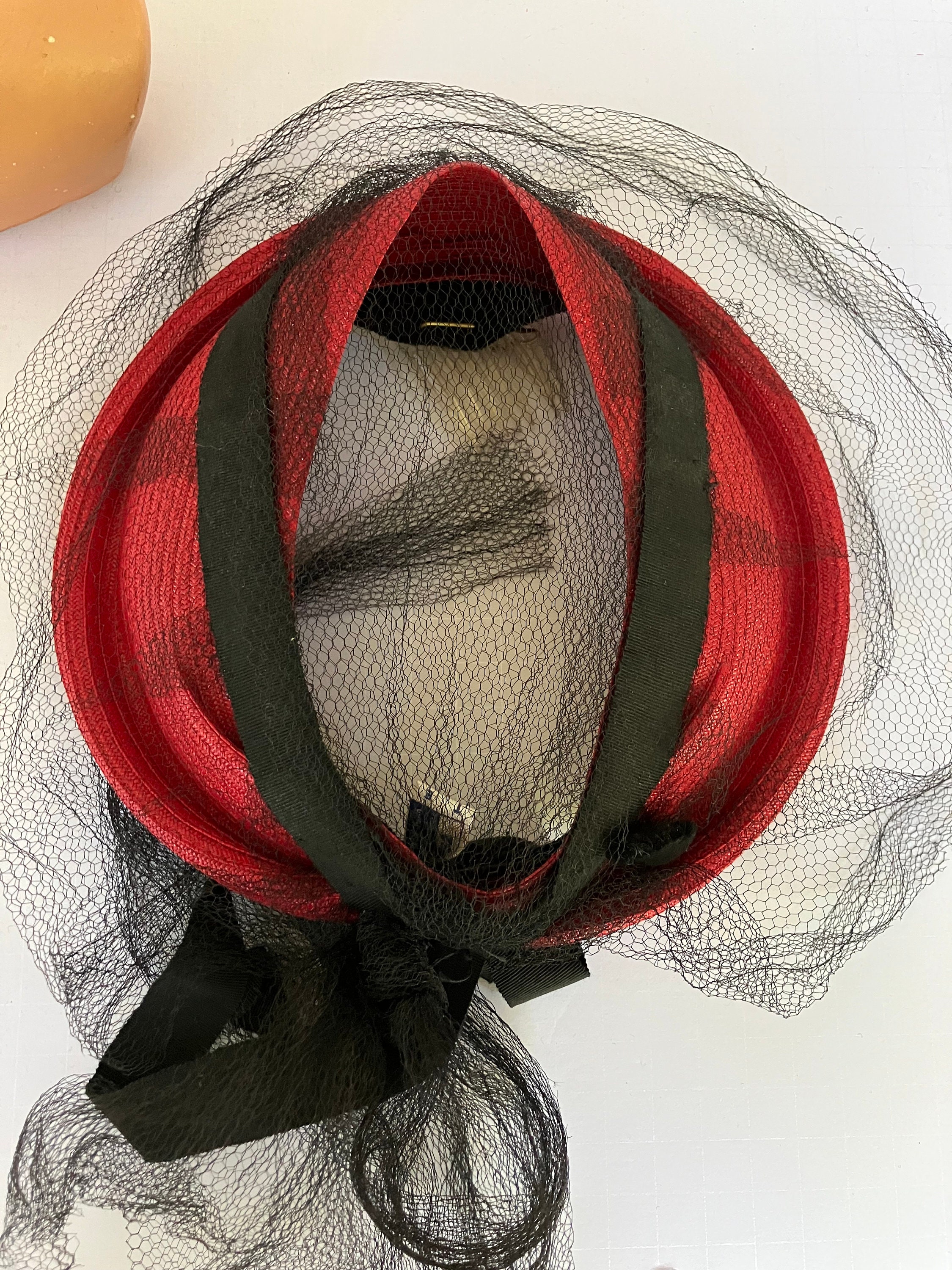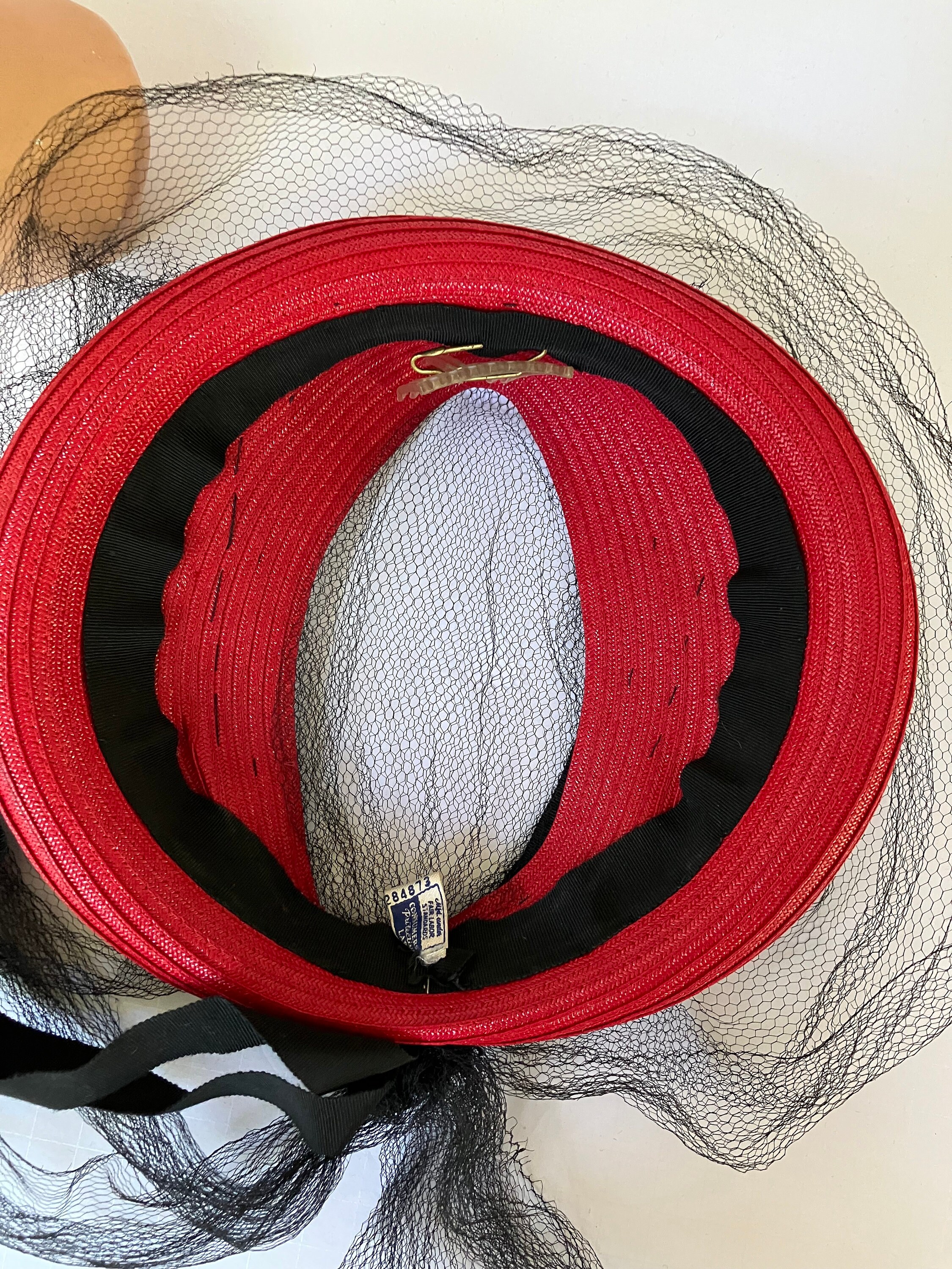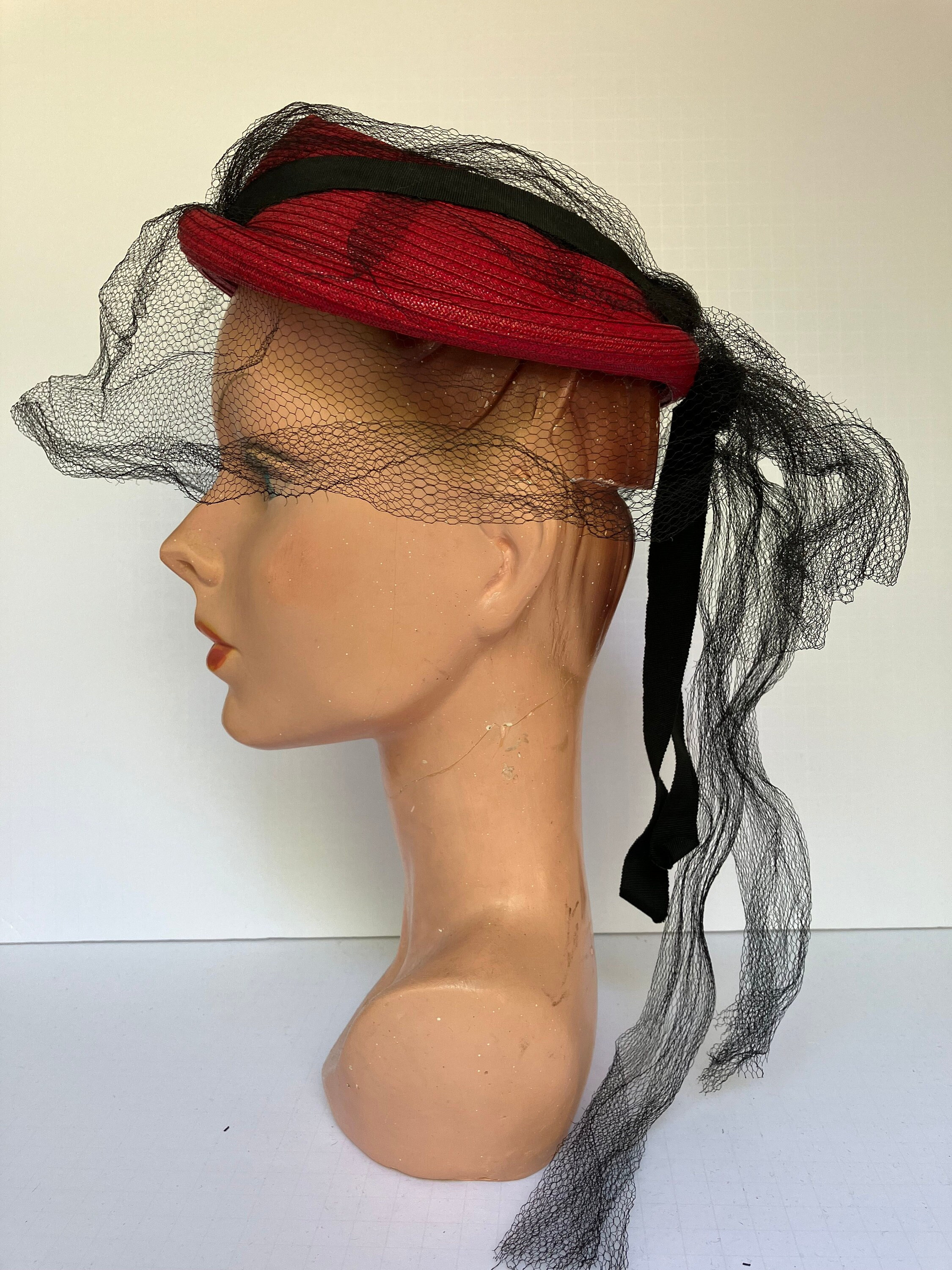 This listing is for a fabulous shiny red straw-like open crown hat with "New York Creation Label." It features black ribbon trim, and veiling. The veil is in good condition but has at least one break.