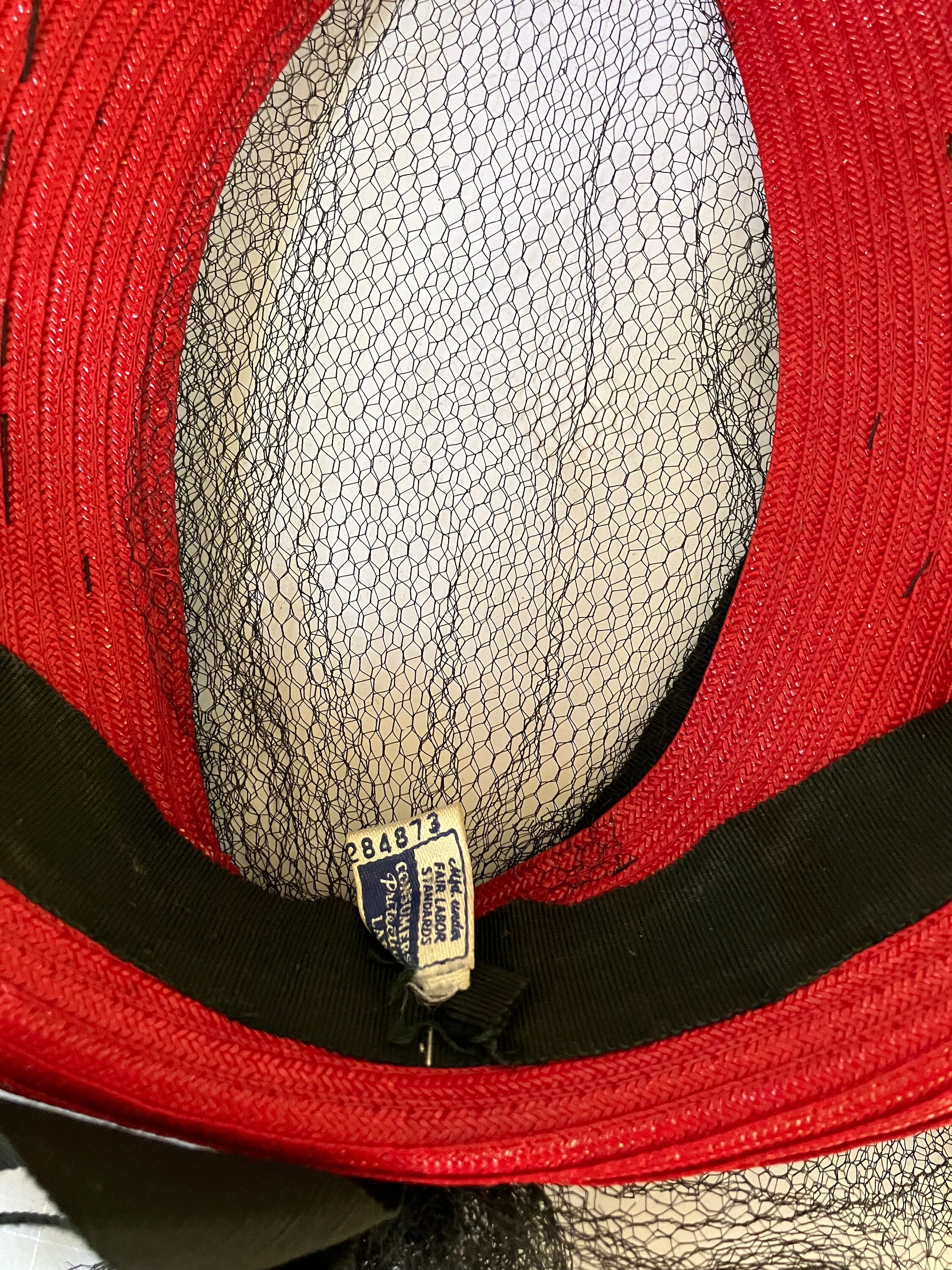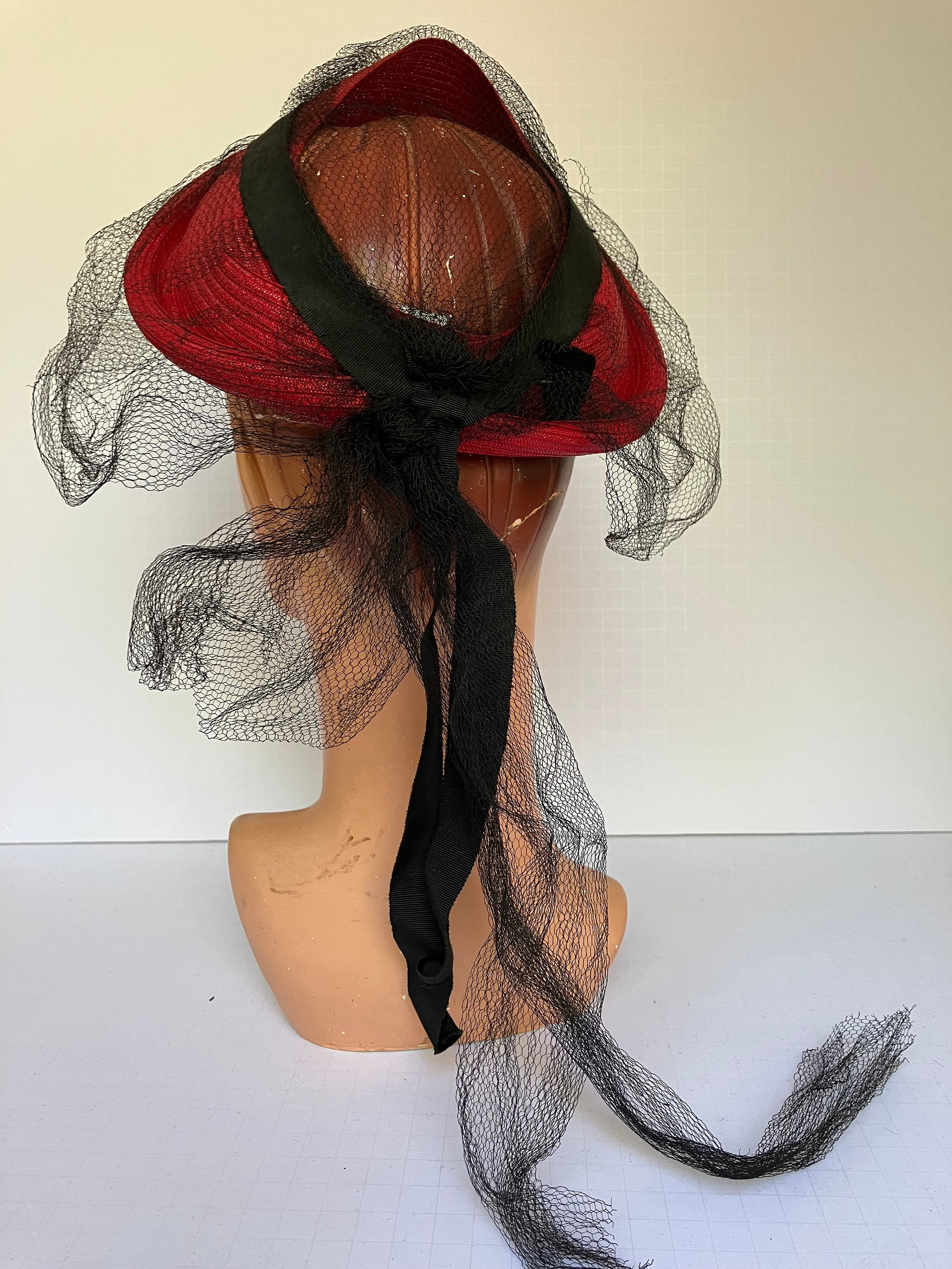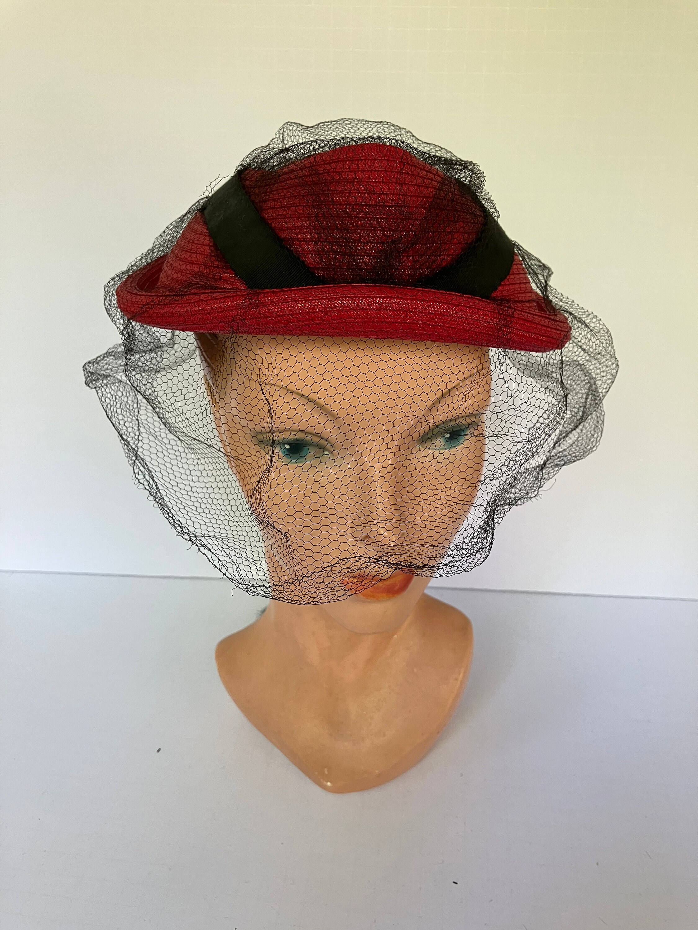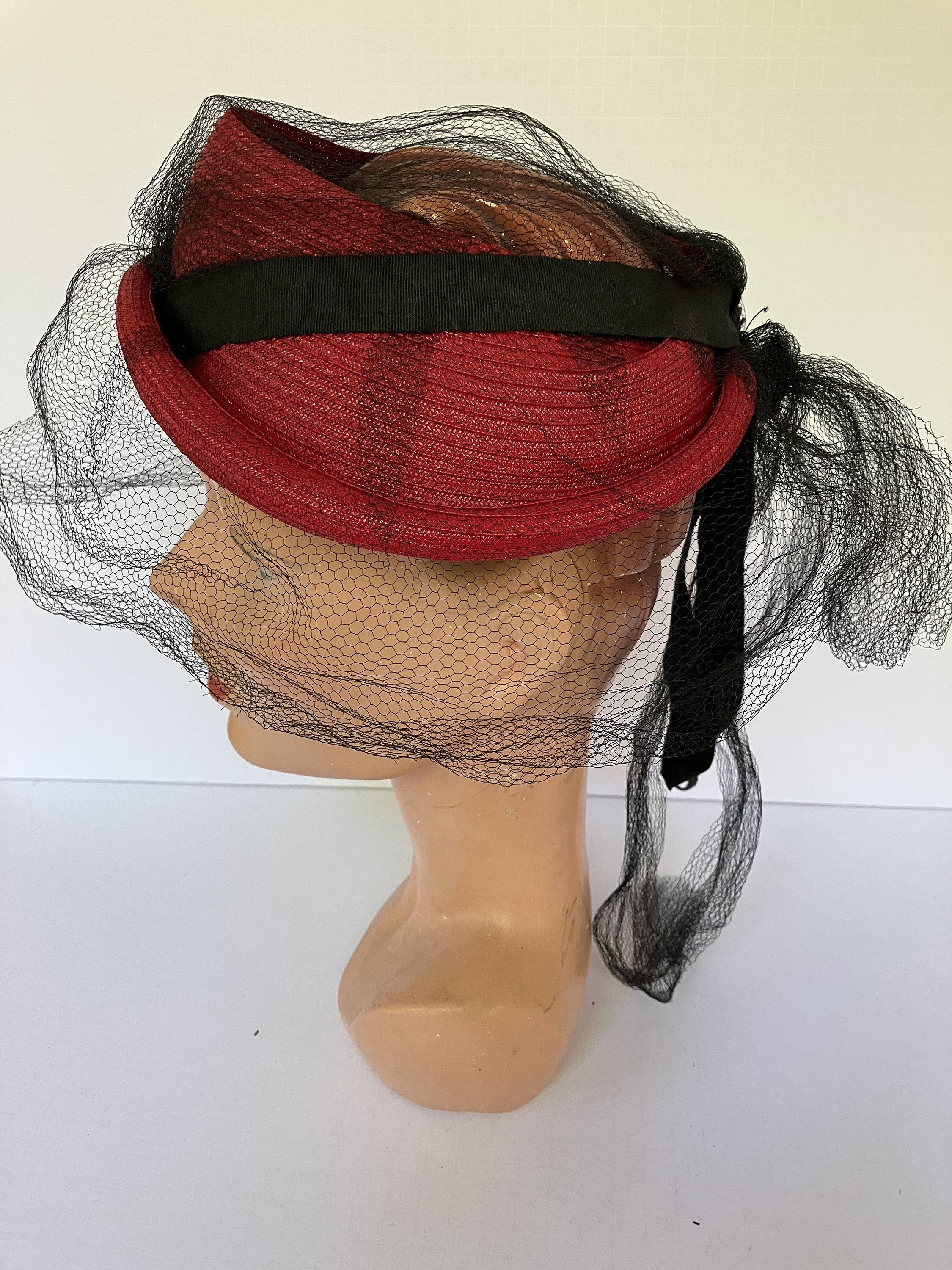 This listing is for a fabulous shiny red straw-like open crown hat with "New York Creation Label." It features black ribbon trim, and veiling. The veil is in good condition but has at least one break.