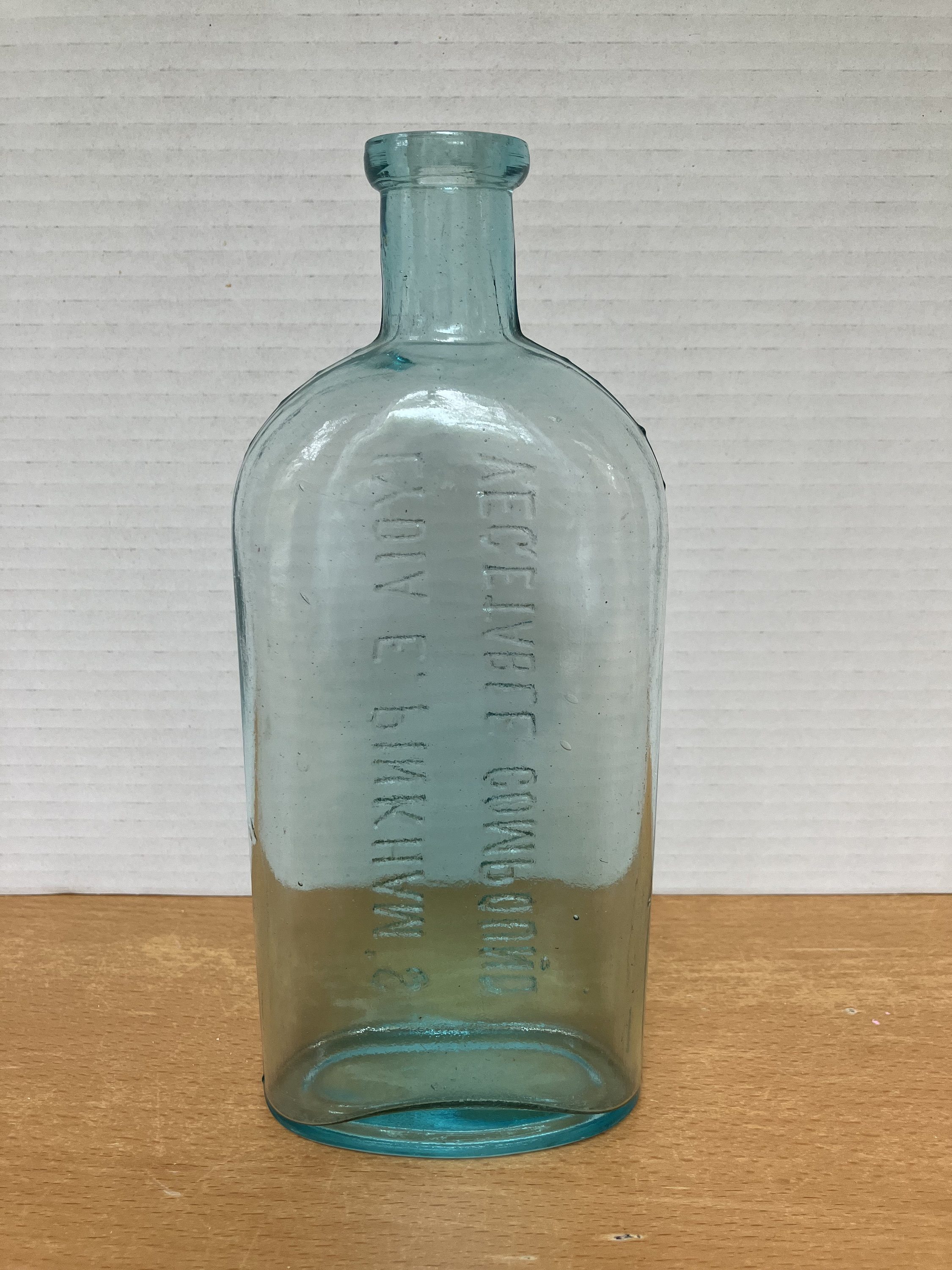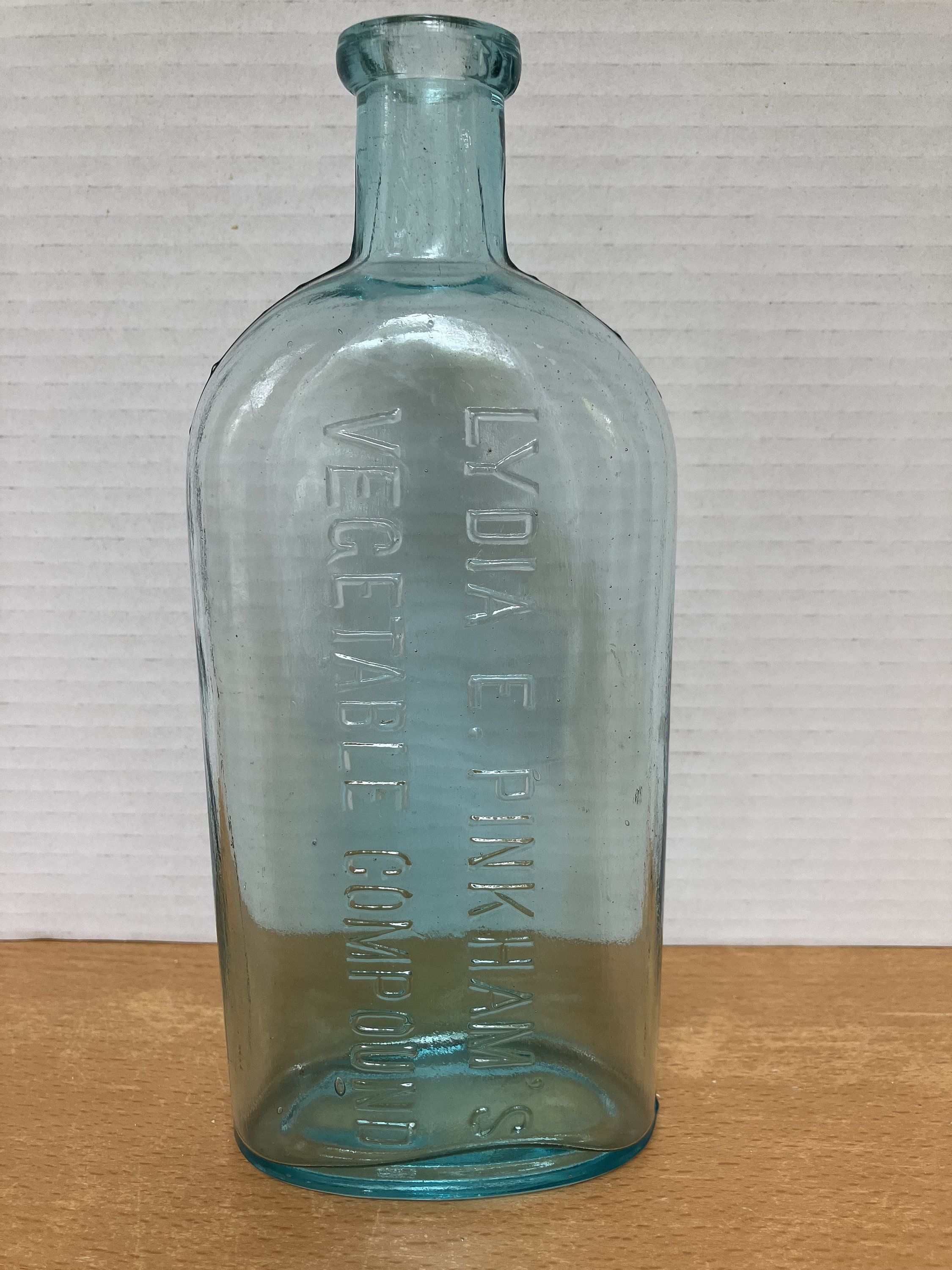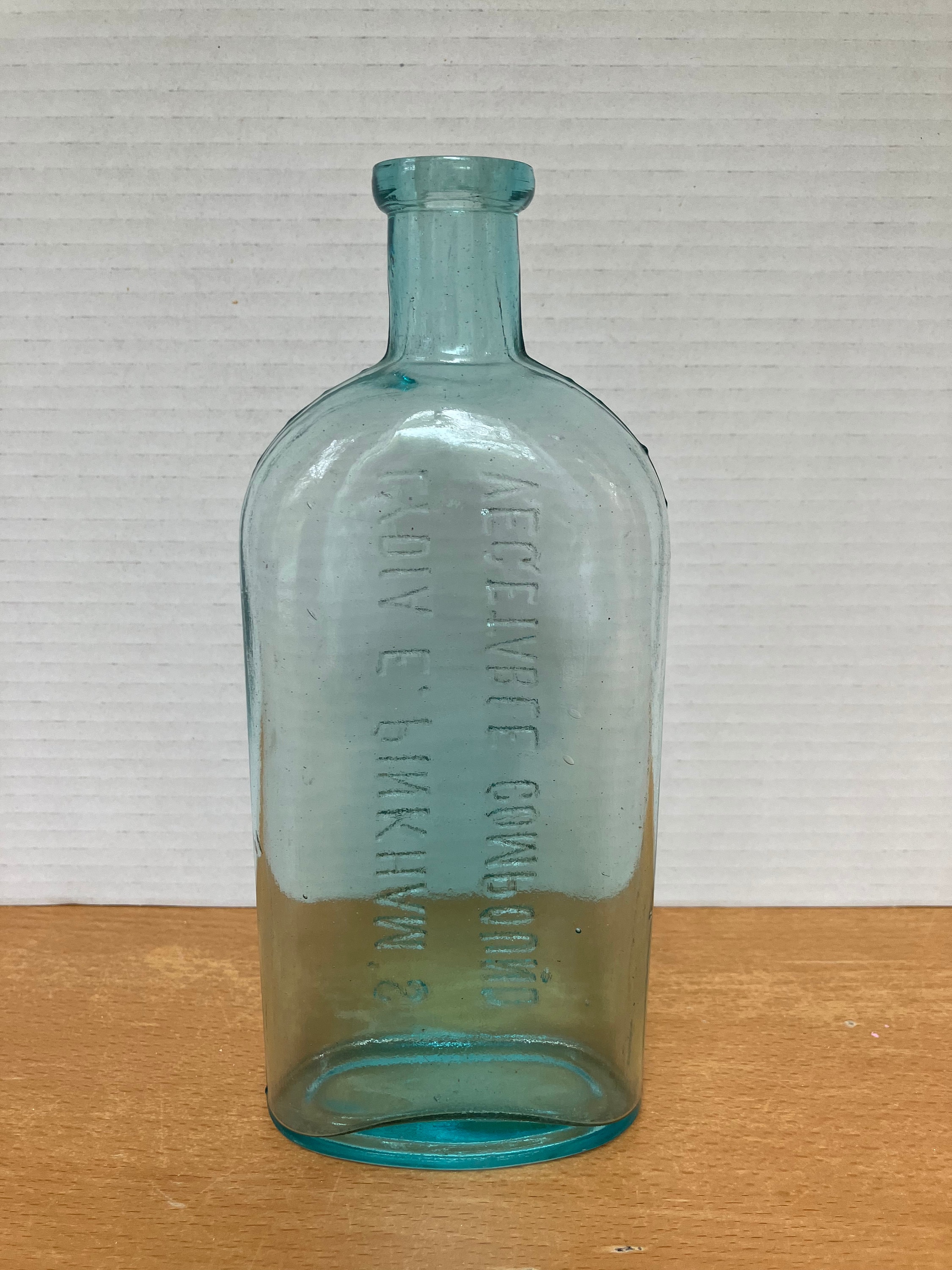 This listing is for an antique aqua glass medicine bottle. Text on bottle reads "Lydia E. Pinkham's Vegetable Compound."