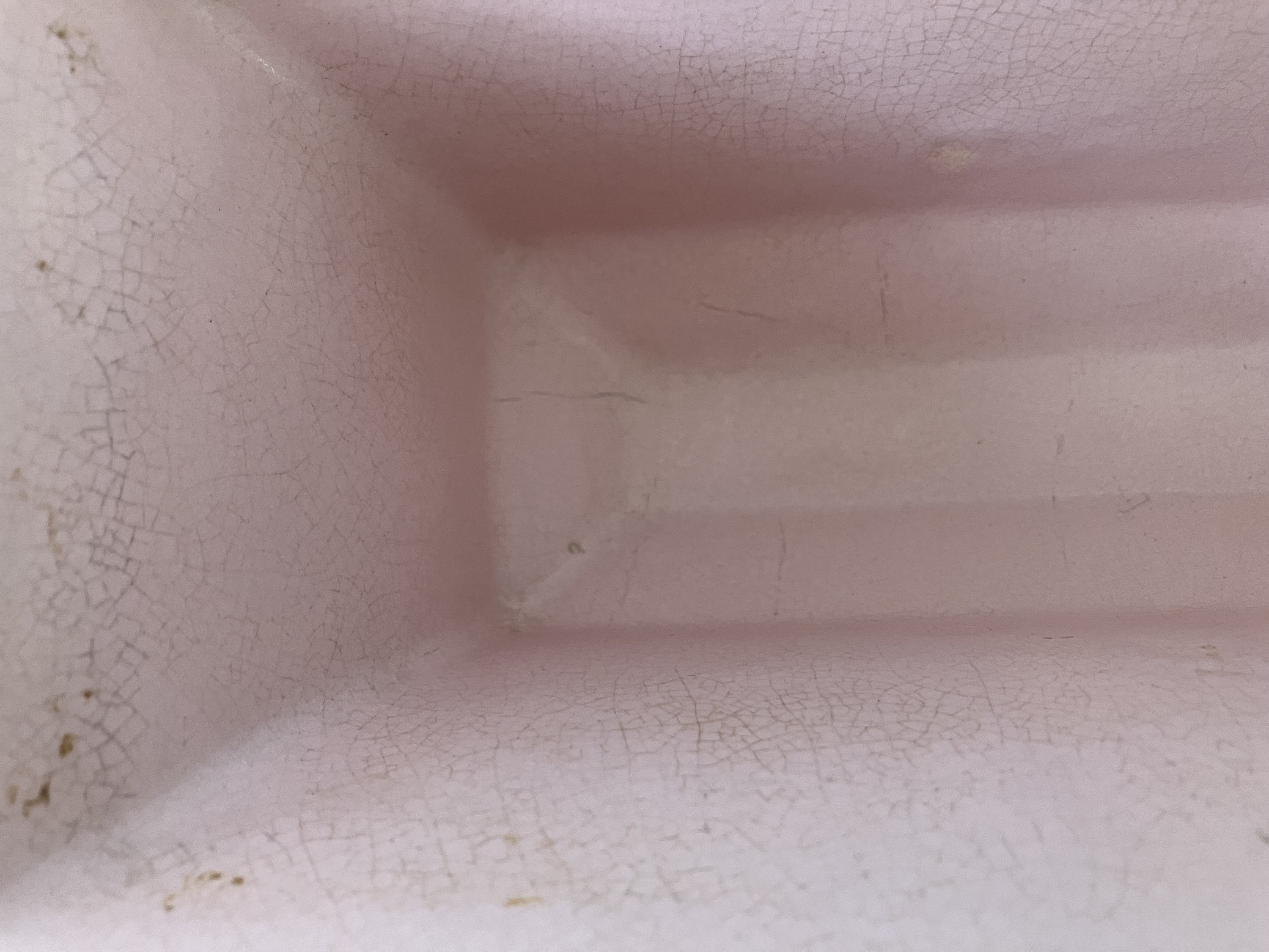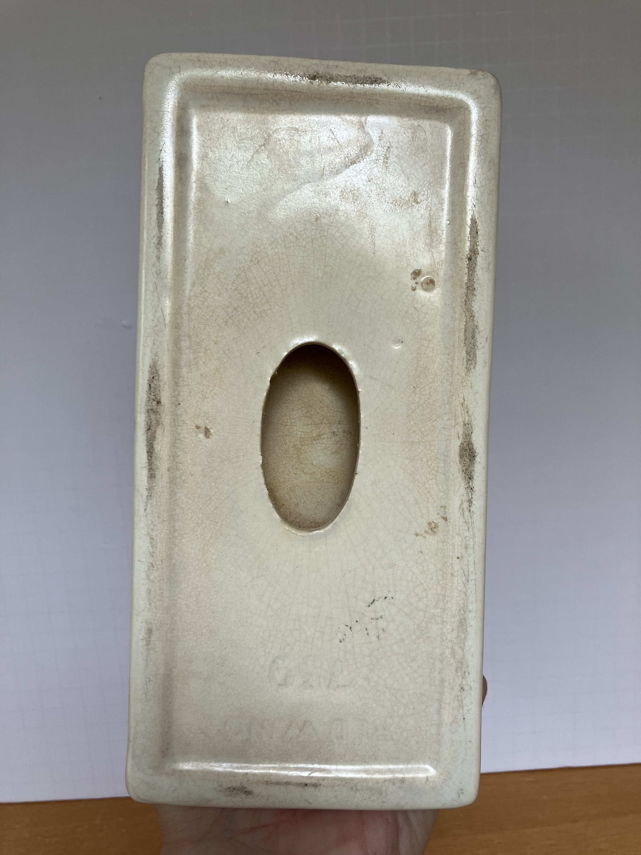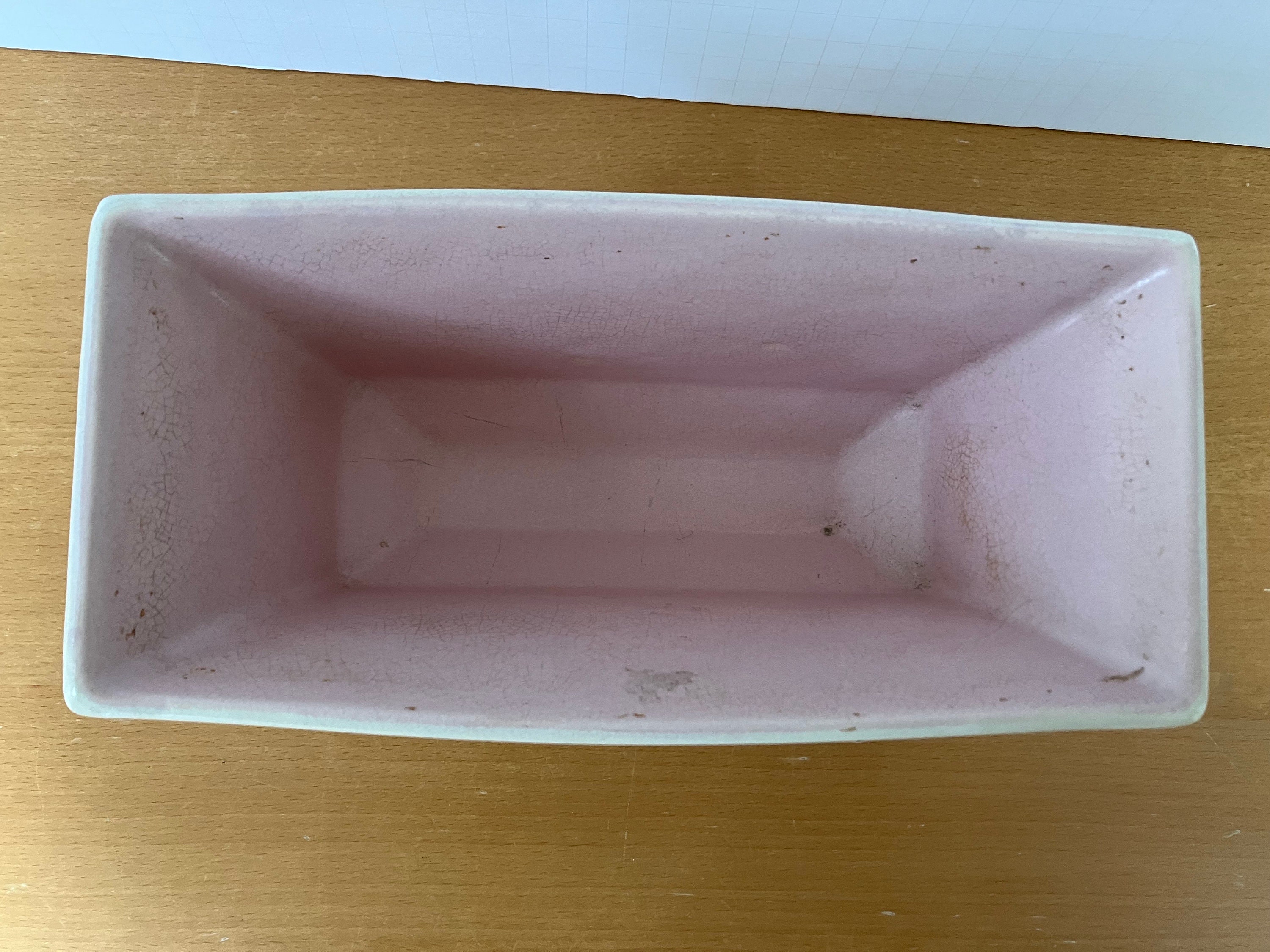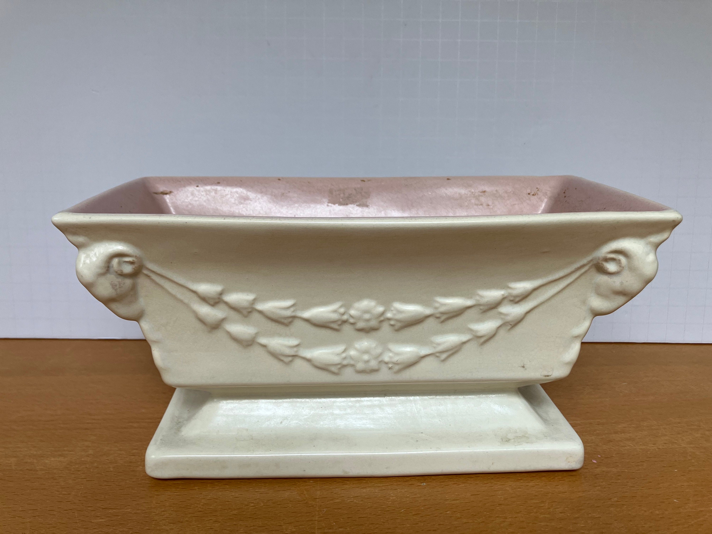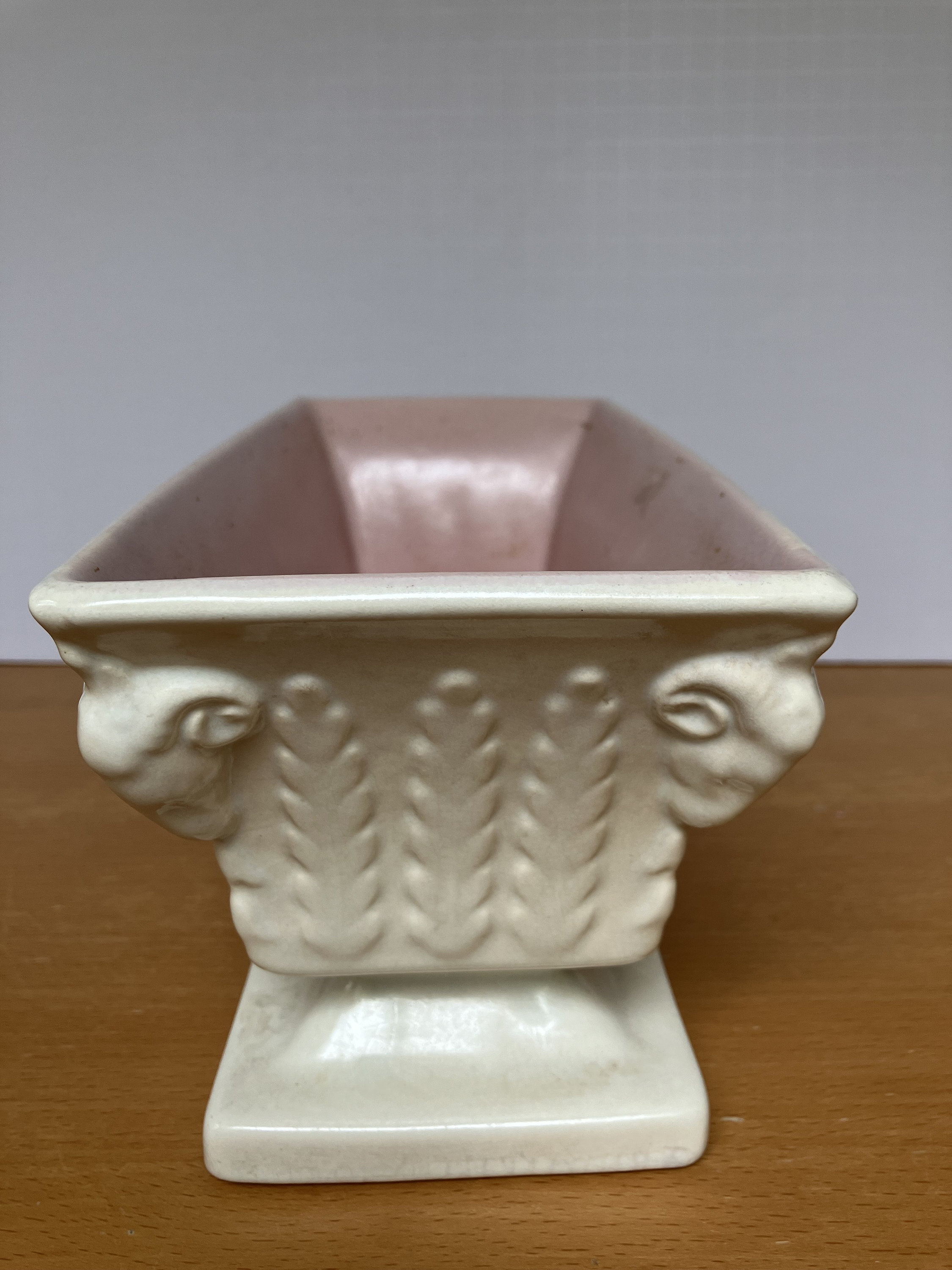 This listing is for an antique Red Wing Pottery rams head rectangular planter with pink interior. Marked number 739.