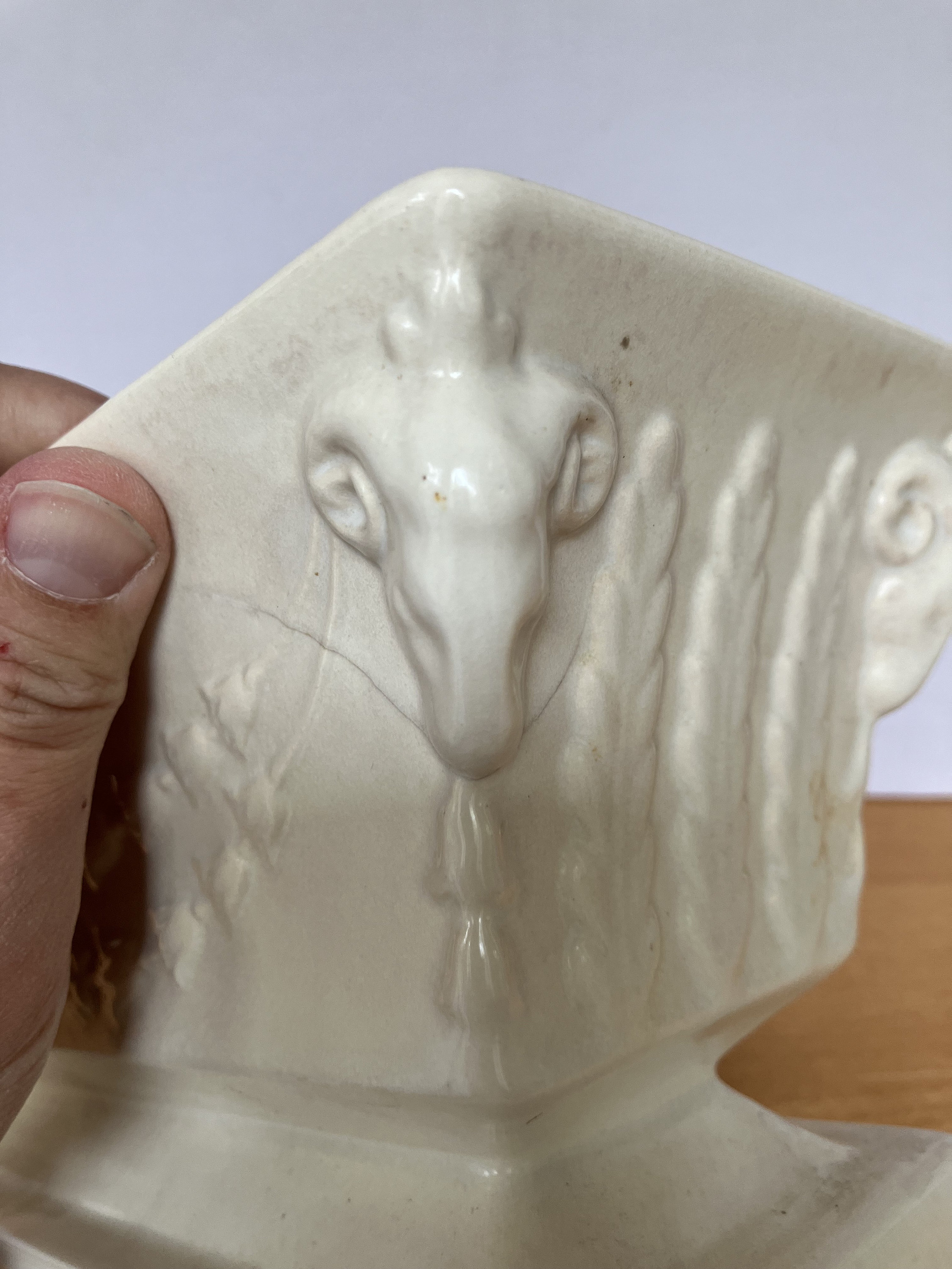 Condition: Good, antique condition. Hairline crack under one ramshead motif, some debris/dirt and discoloration. Crazing especially on interior. Please see photos.