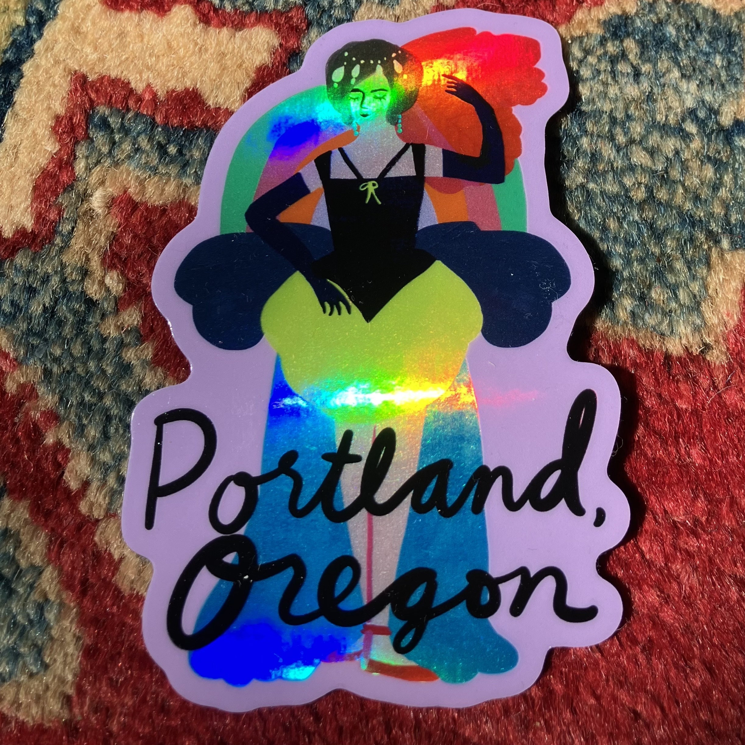 This sticker is my rainbow showgirl "Portland, Oregon" design. The background of the sticker is light purple.